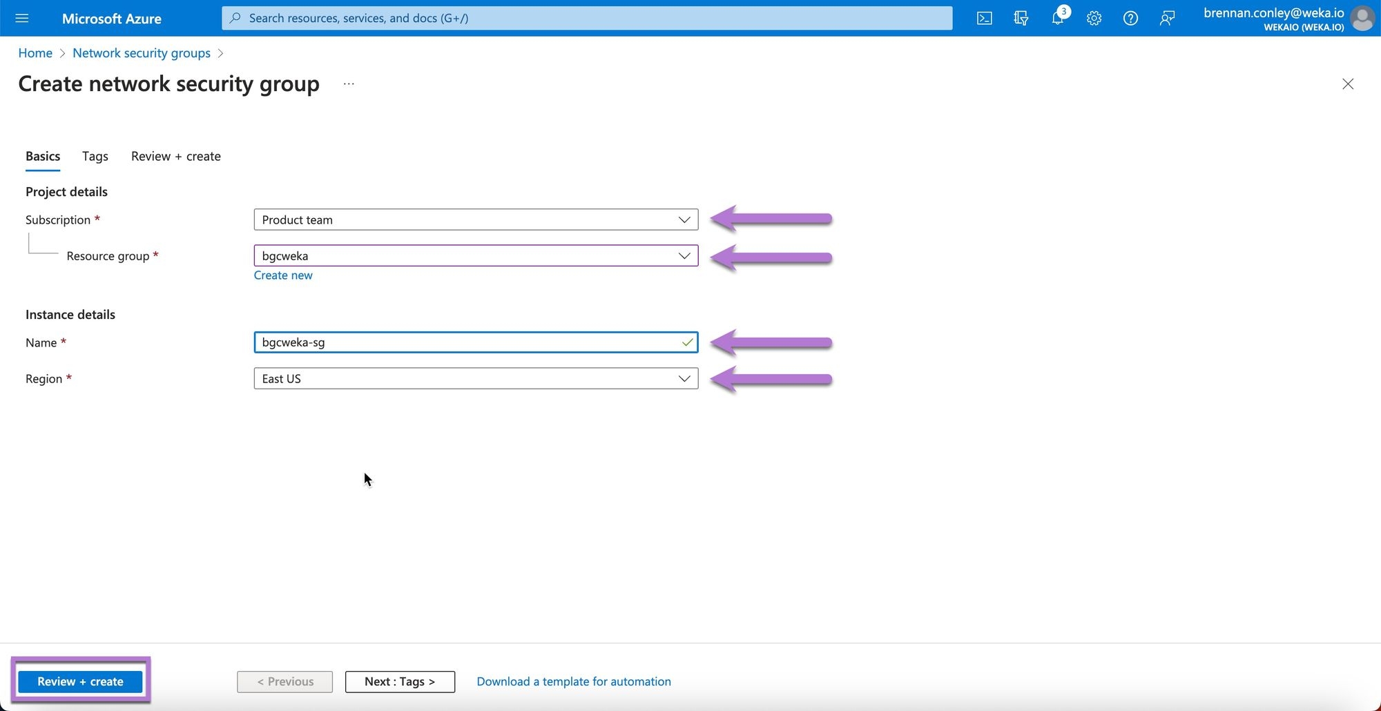 On the Create network security group page, enter the required details, including the subscription and resource group from earlier steps. Ensure the region matches other resources. Select Review + create.