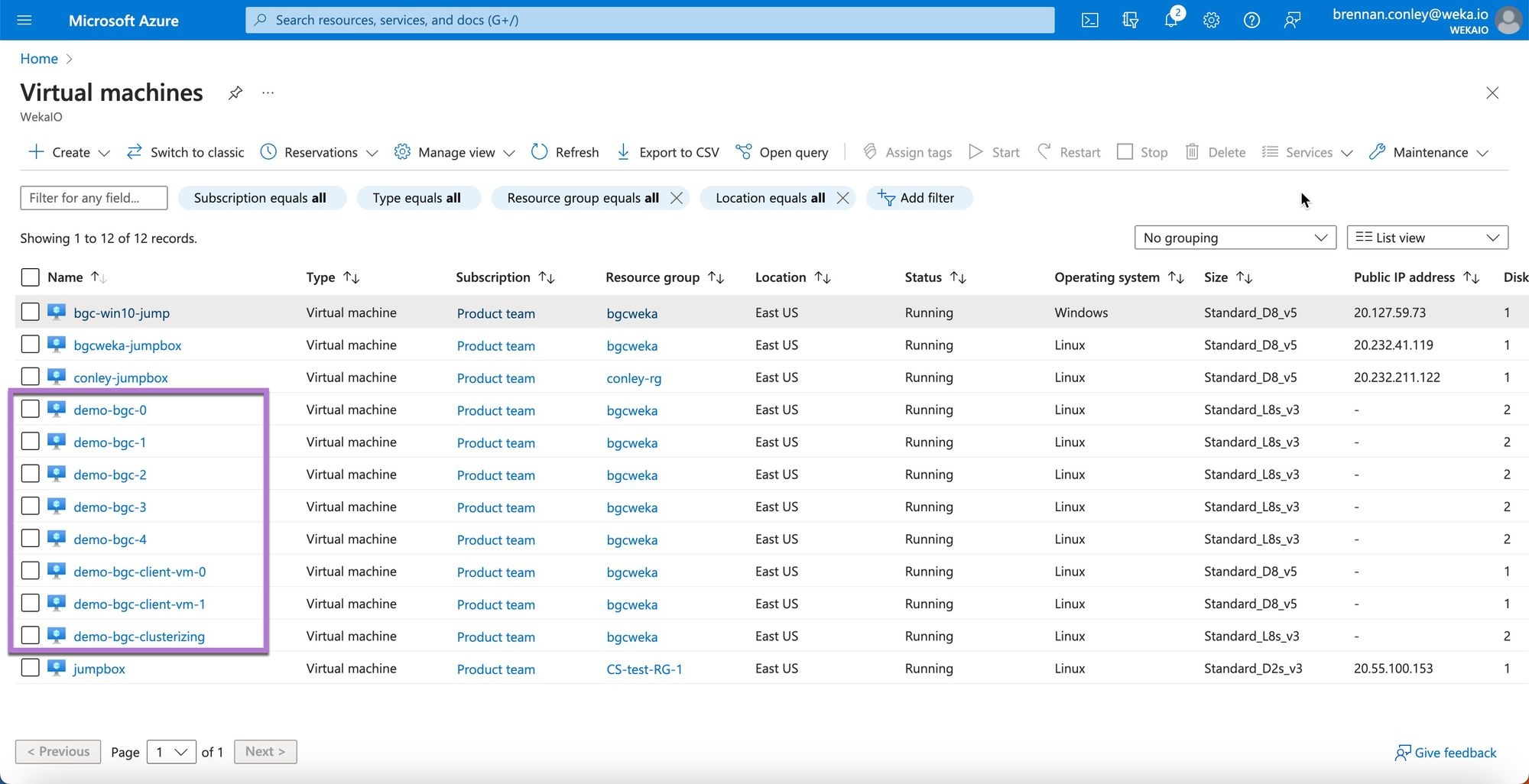 In the Azure portal Virtual Machines page, view the WEKA cluster instance resources.