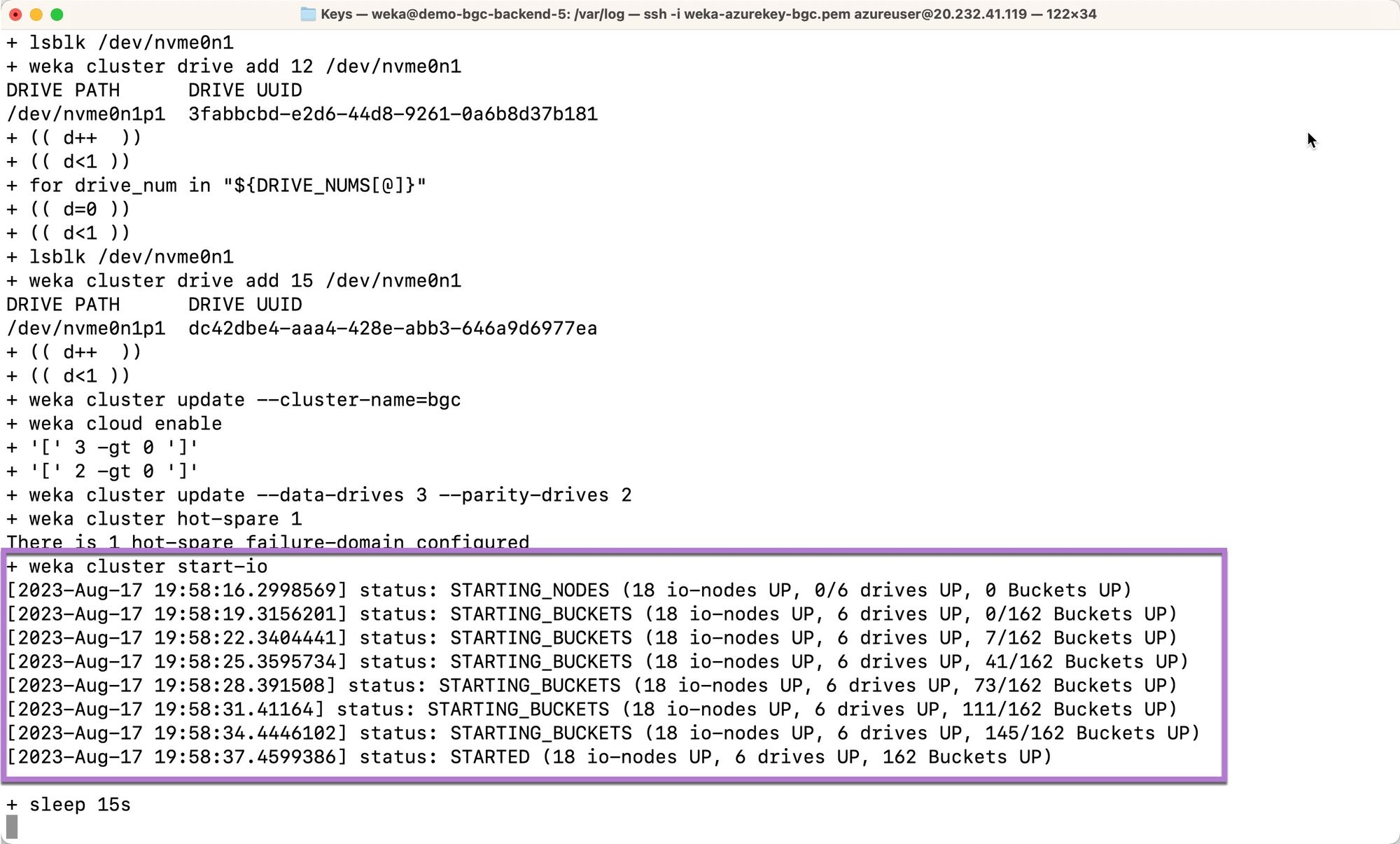 The install script will start-io. At this point, i-nodes and WEKA buckets will begin coming online.