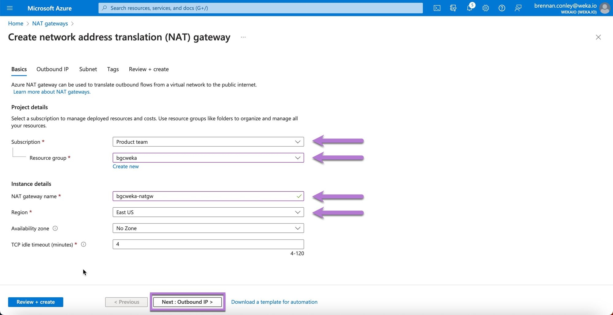 On the Create network address translation (NAT) gateway page, enter the required details. Select the correct subscription and resource group, specify a name and region, and select Next: Outbound IP.