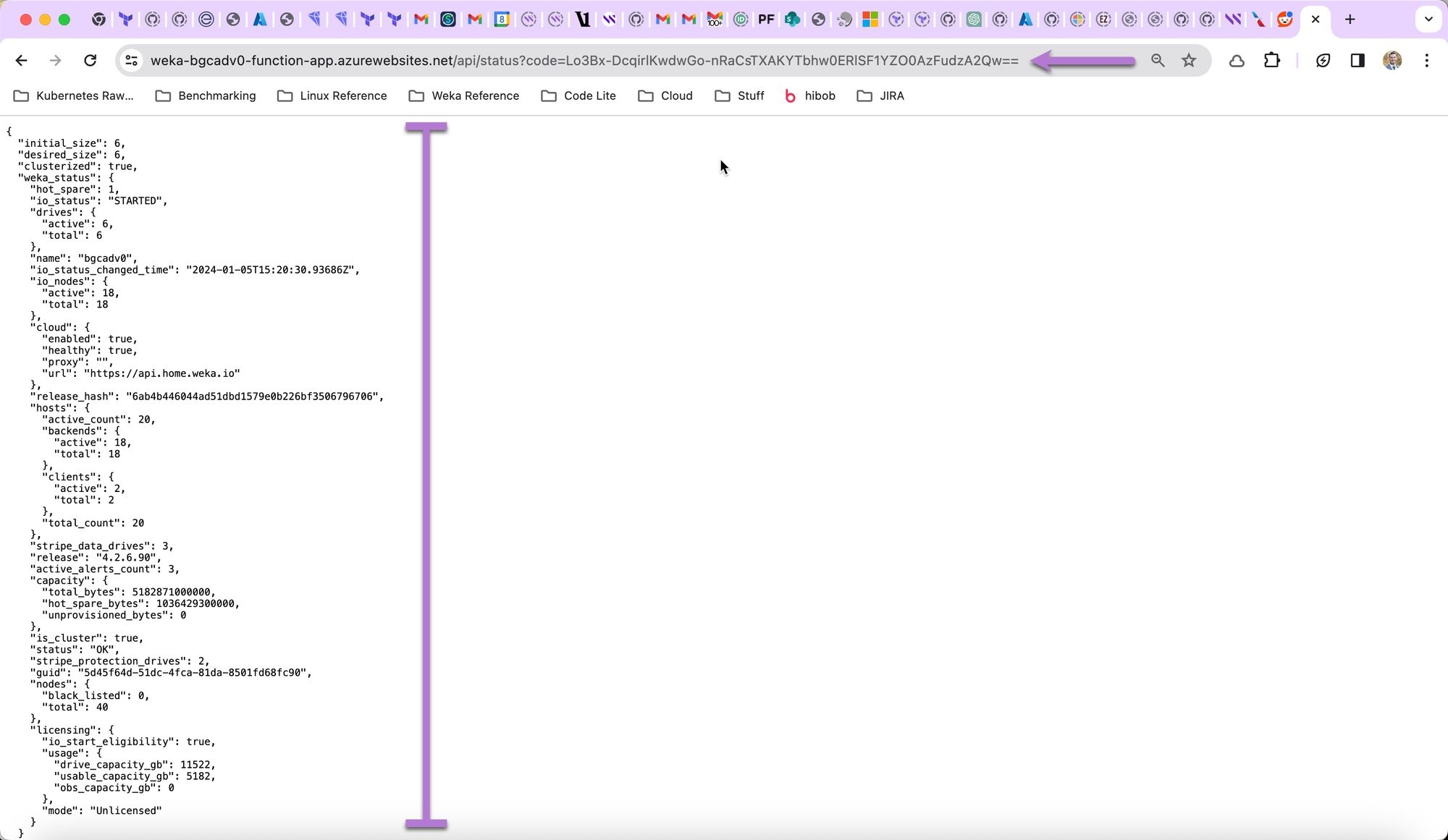 Copy the URL and paste it into a web browser. The clusterization status of the deployed WEKA cluster displays. Review the returned data to confirm the cluster deployment.