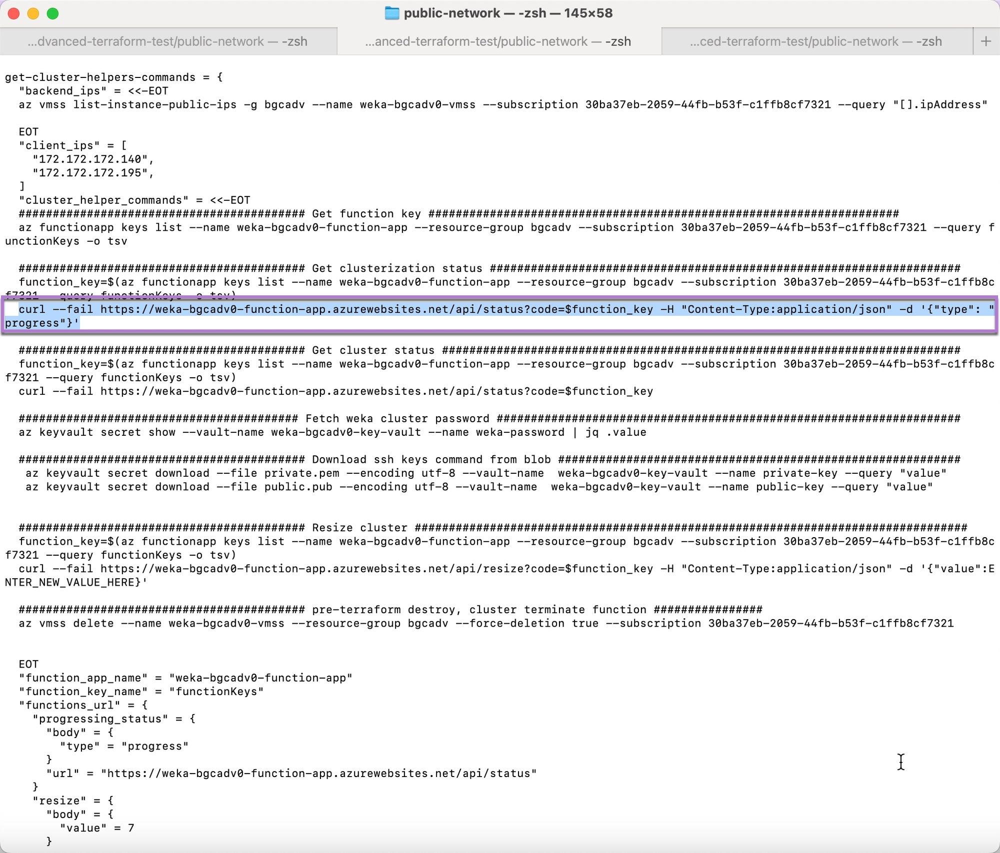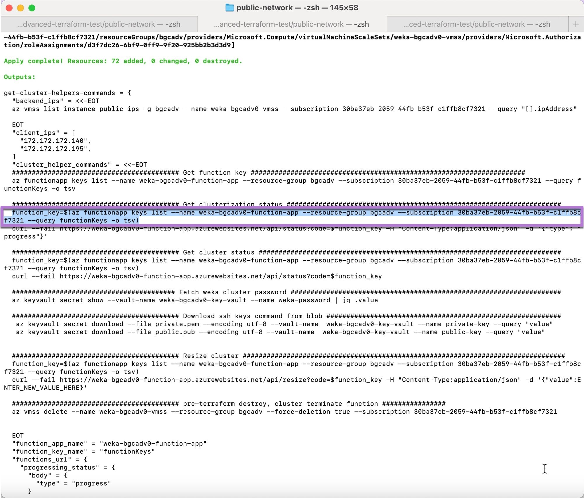 The final entry instructs Terraform to output useful information for verifying the WEKA cluster's deployment and connection: