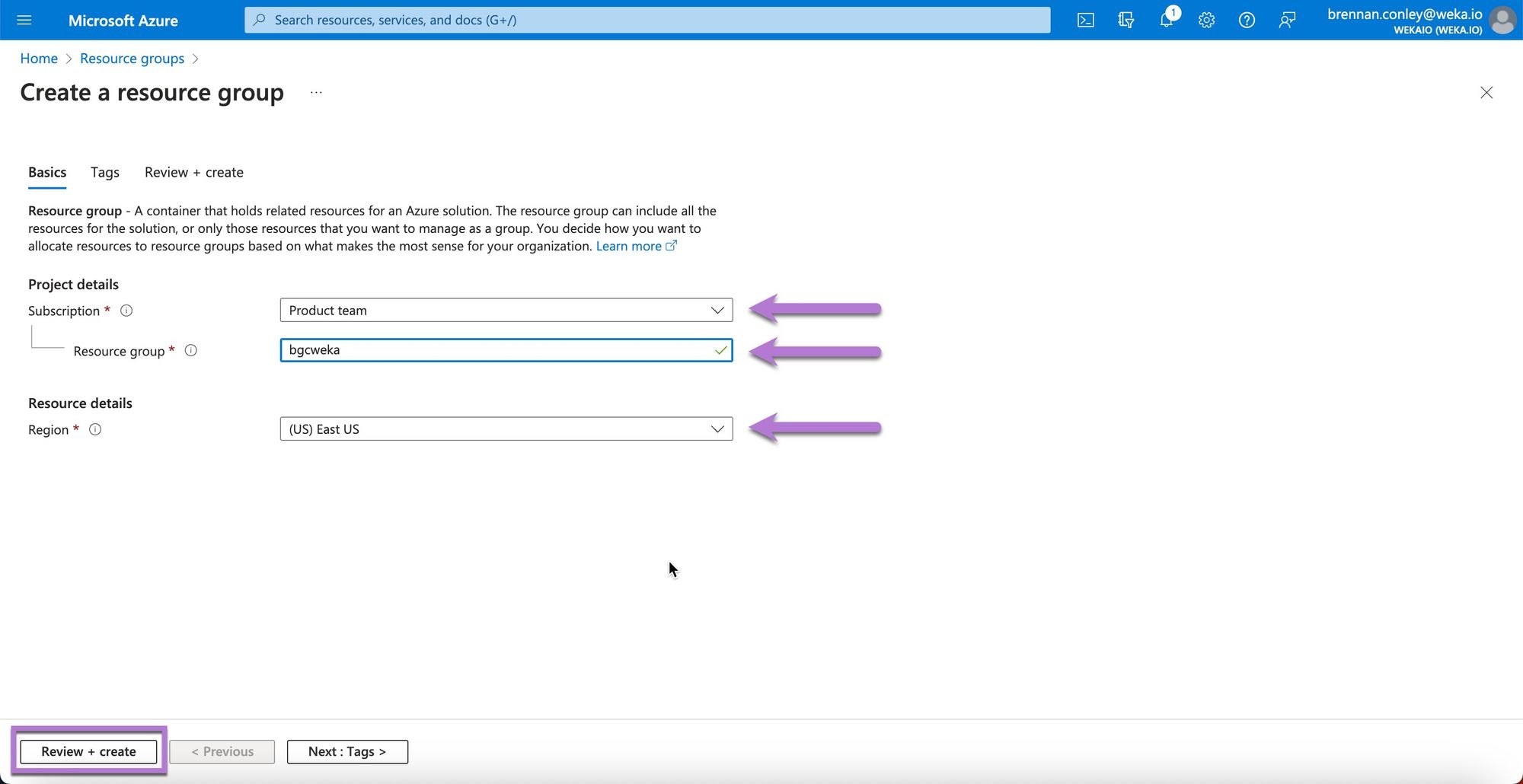 On the Create resource group page, enter the required details, ensuring you select the correct subscription and region. Select Review + create. (Once named, a Resource Group cannot be renamed.)