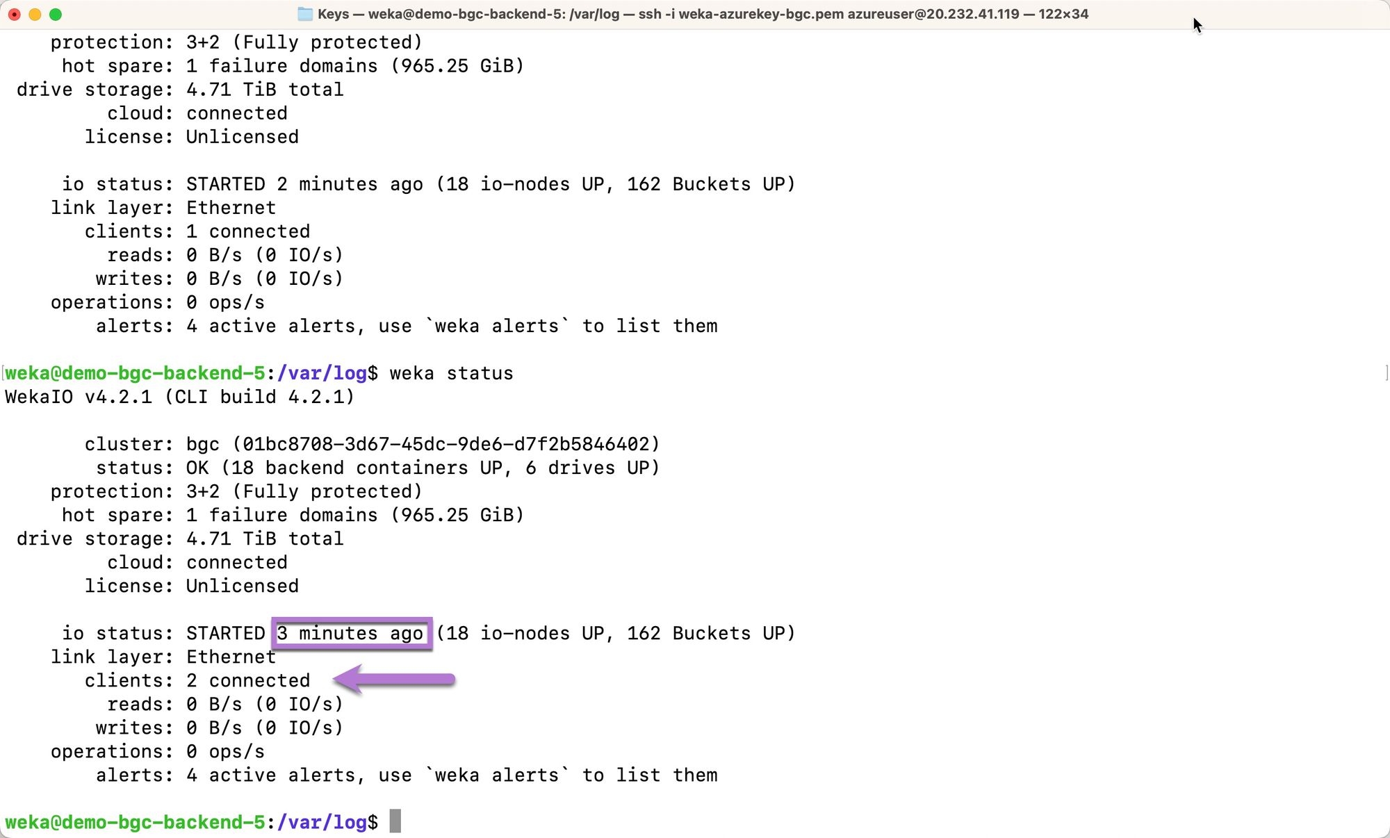 The following example shows that the two clients are successfully connected to the cluster three minutes after cluster io starts.