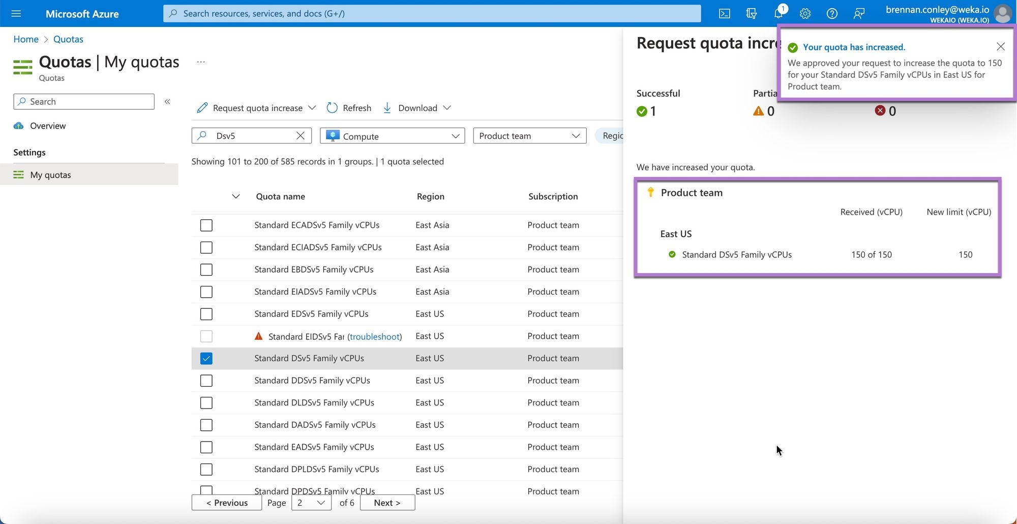 When deploying resources in Microsoft Azure, ensure sufficient quotas are set for the specific resources needed. For instance, when deploying Lsv3 virtual instances for the WEKA backend cluster, configure an adequate vCPU quota for the Lsv3 instance type. Azure specifies quotas on a per-instance or per-instance-family basis.