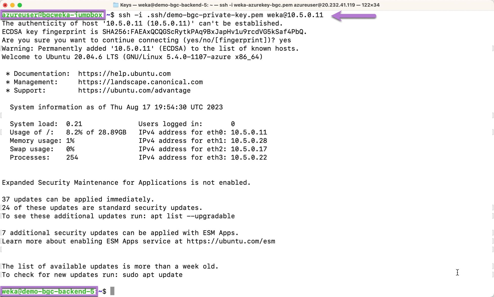 SSH to the Azure linux jump box using the applicable private key and public IP address. This private key is not the WEKA cluster SSH private key saved to the
