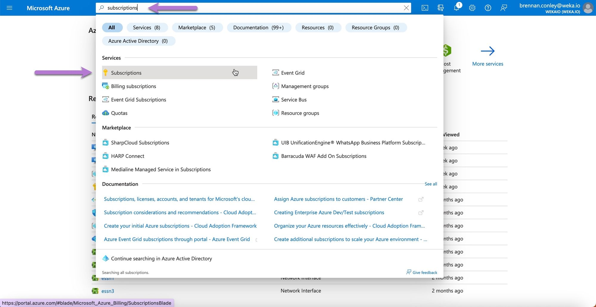 Navigate to the Microsoft Azure Portal. Search for Subscriptions and select it.