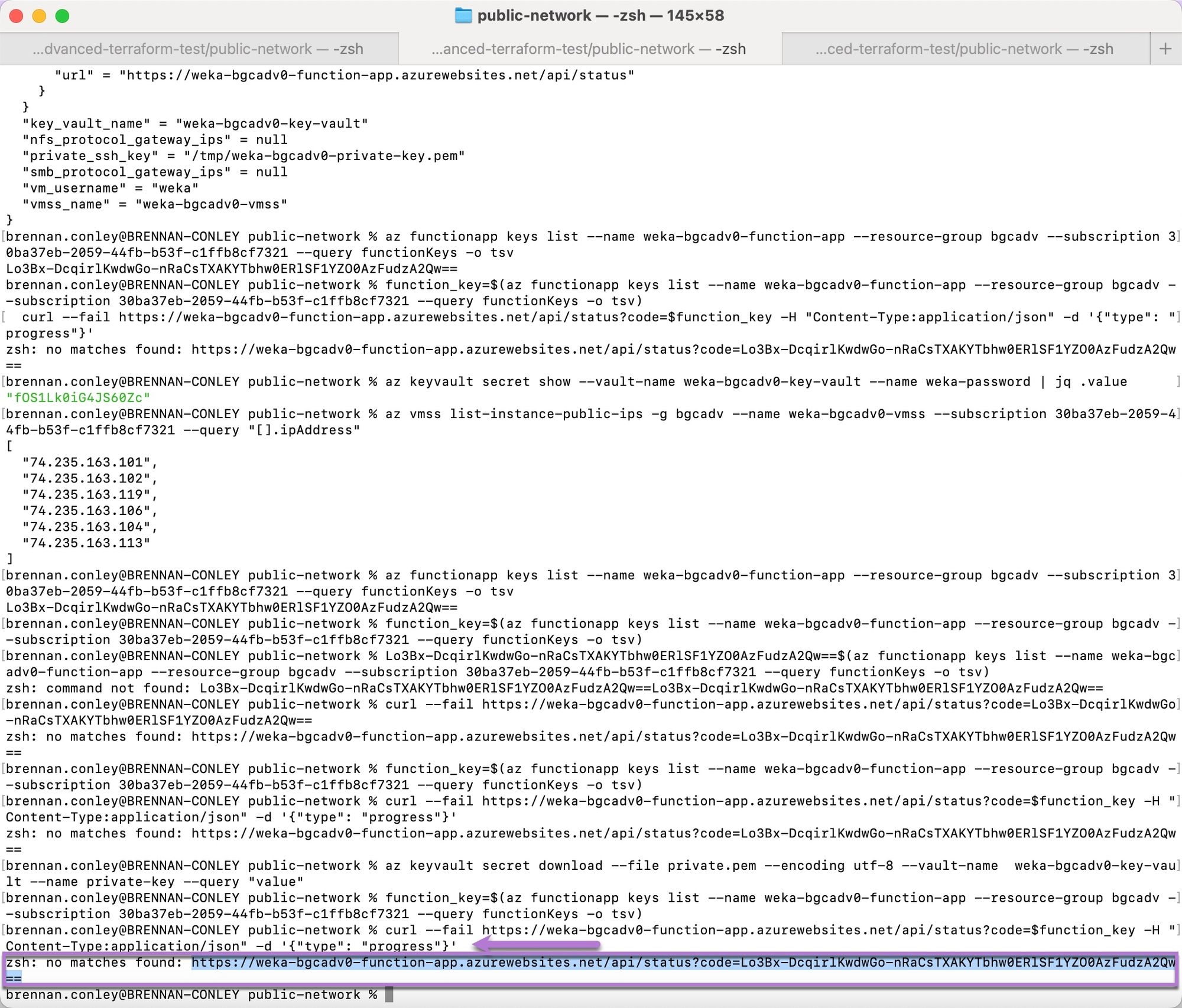 Paste the copied command into the terminal, and run it. The public IP addresses display.