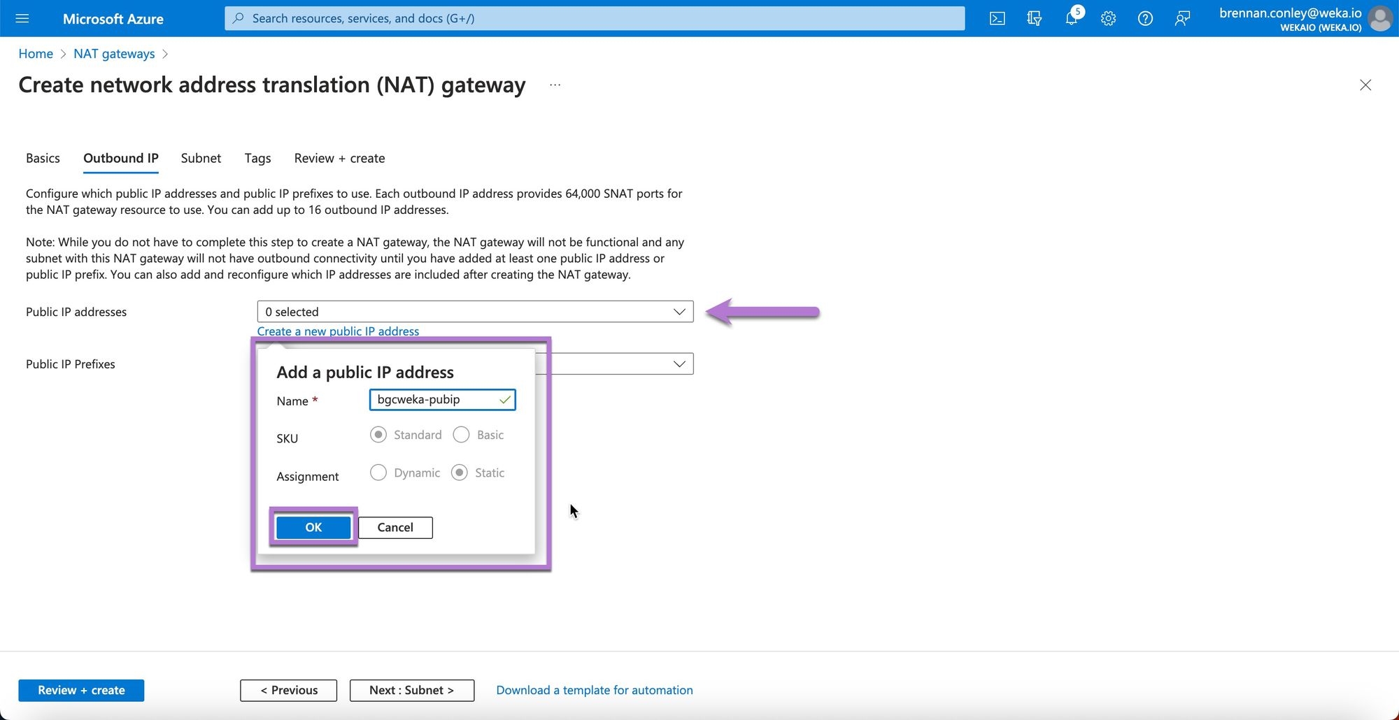 In the Outbound IP section, select Create a new public IP address, enter a name for the public IP, and select OK.