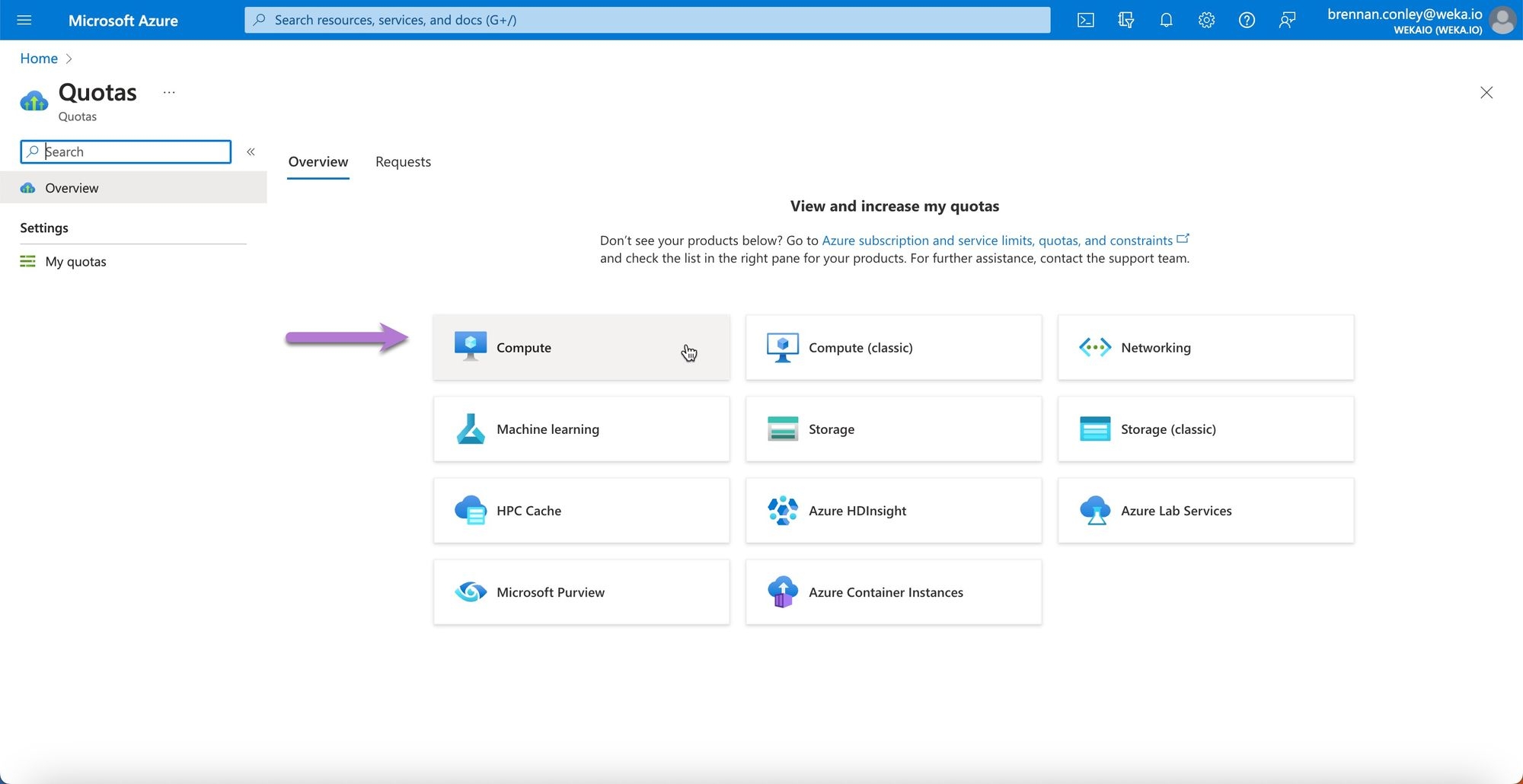 On the quotas page, select Compute.