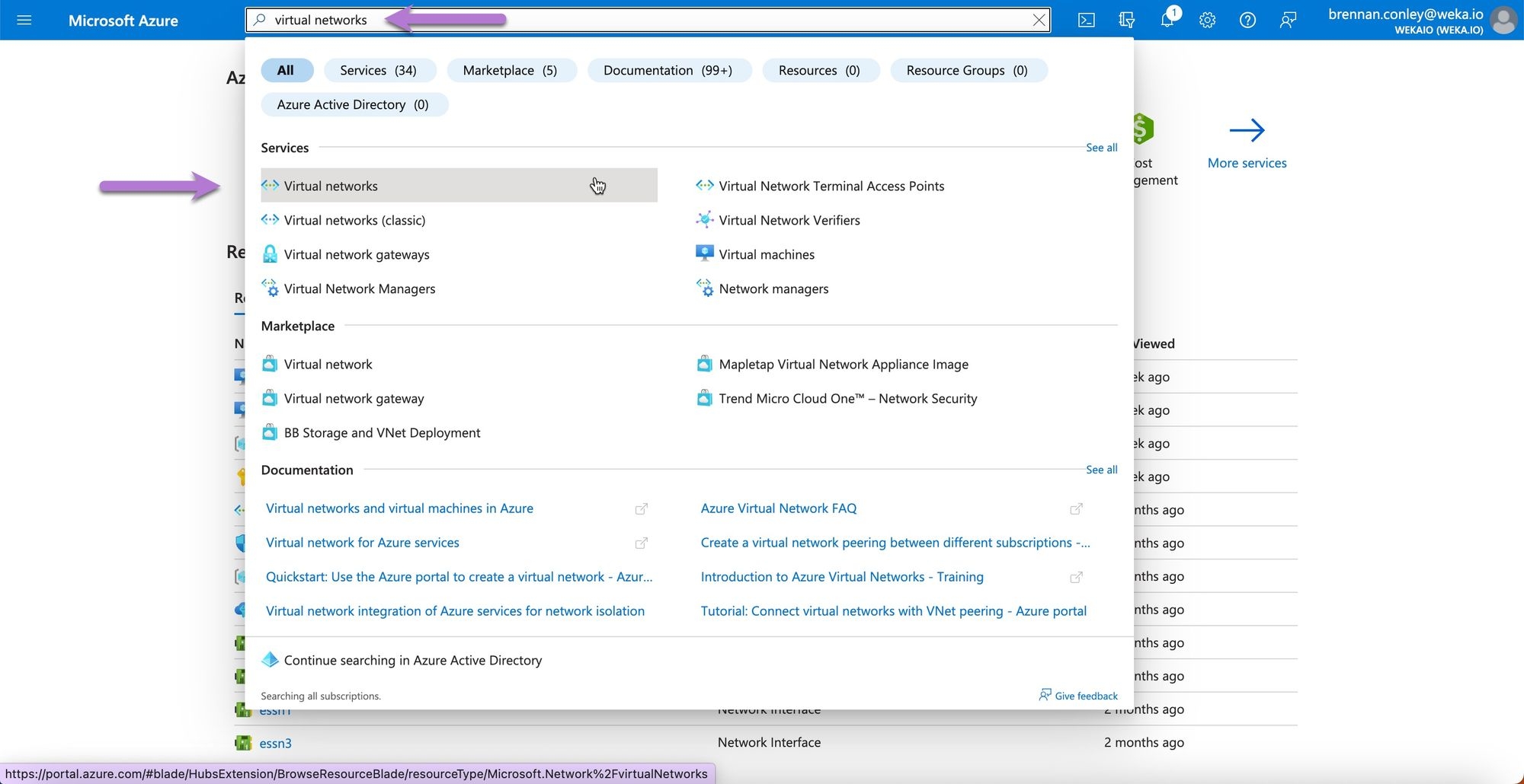 Search for Virtual networks in the Azure Portal and select it.
