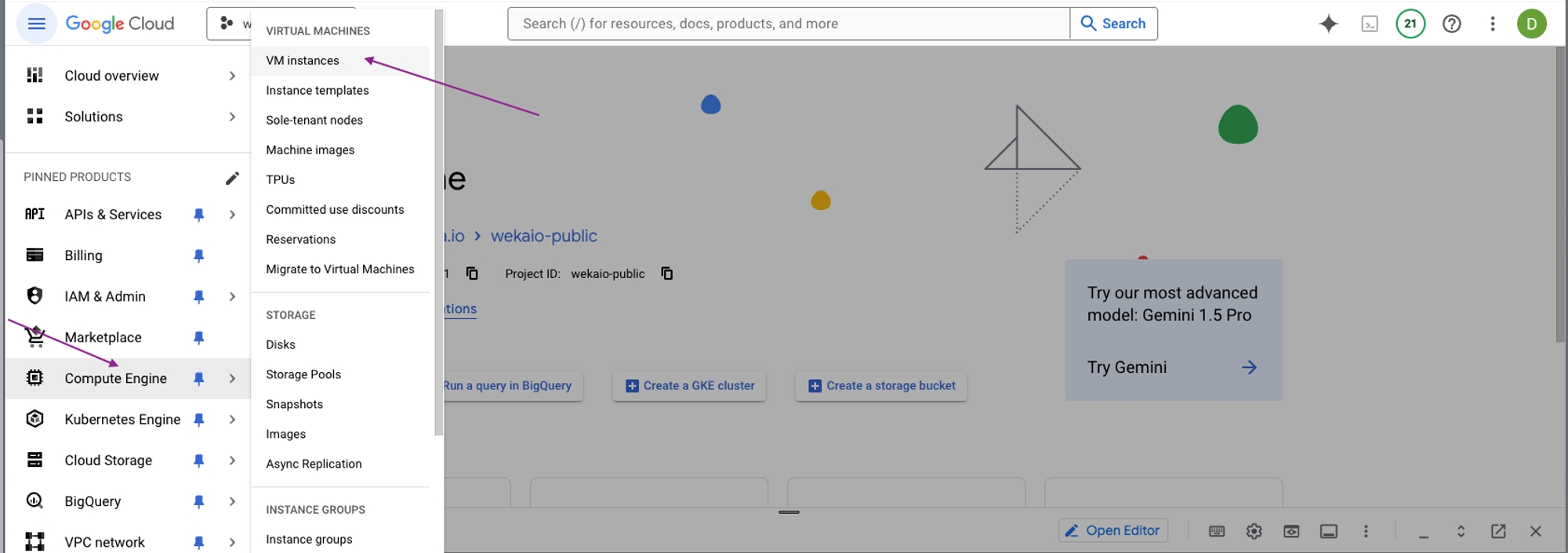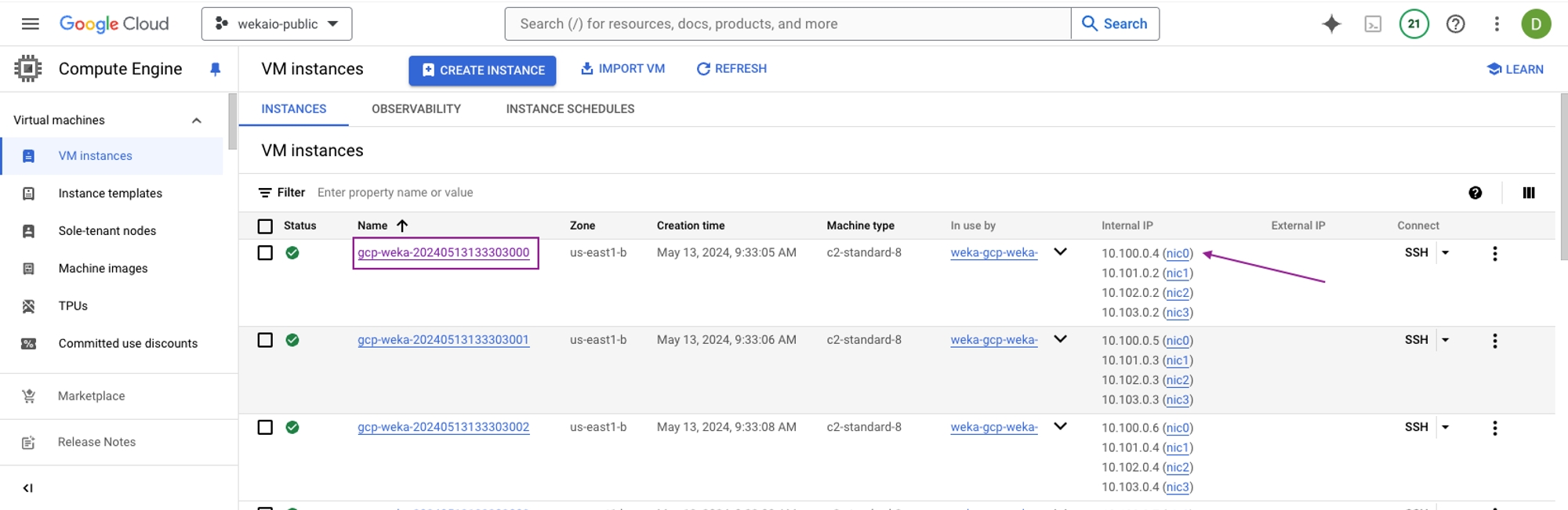 You can access the WEKA cluster backend instances through SSH directly from the GCP browser window. This method allows you to run WEKA CLI commands and gather logs as needed.