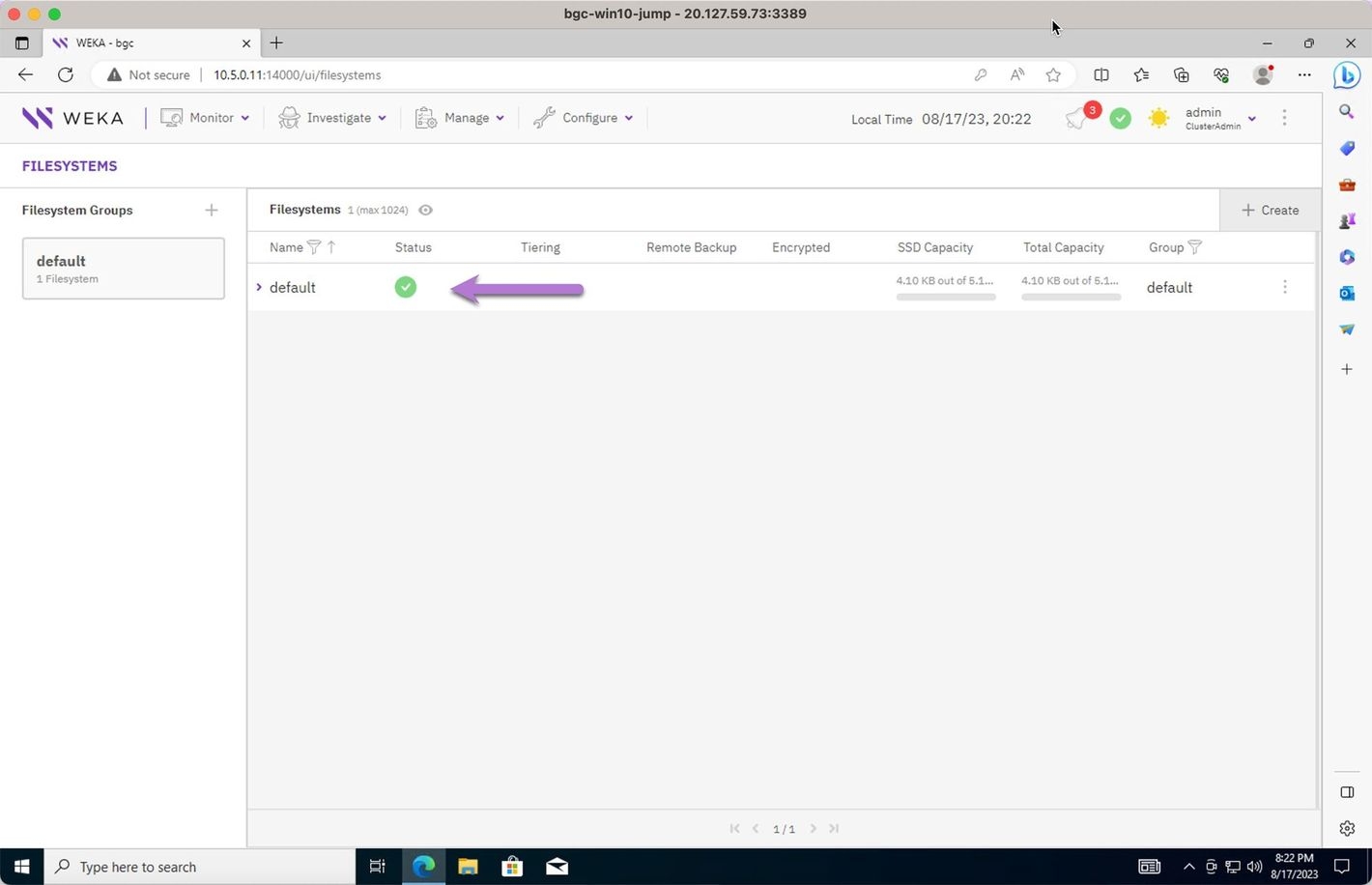 {"initial_size":7,"desired_size":8,"clusterized":true,"weka_status":{"hot_spare":1,**"io_status":"STARTED"**,"drives":{"active":16,"total":16},"name":"gcp-weka","io_status_changed_time":"2024-05-13T13:43:50.740546Z","io_nodes":{"active":24,"total":24},"cloud":{"enabled":true,"healthy":true,"proxy":"","url":"https://api.home.weka.io"},"release_hash":"f94d361cf0e465a4f04214064b5f019b9149baf3","hosts":{"active_count":24,"backends":{"active":24,"total":24},"clients":{"active":0,"total":0},"total_count":24},"stripe_data_drives":4,"release":"4.3.0","active_alerts_count":2,"capacity":{"total_bytes":3376488600000,"hot_spare_bytes":482217460000,"unprovisioned_bytes":482217460000},"is_cluster":true,"status":"OK","stripe_protection_drives":2,"guid":"603d3b67-03ce-49af-8833-4f2e6a985b1e","nodes":{"black_listed":0,"total":48},"licensing":{"io_start_eligibility":true,"usage":{"drive_capacity_gb":6442,"usable_capacity_gb":3376,"obs_capacity_gb":0},"mode":"Unlicensed"}}}The section "io_status":"STARTED" shows that the cluster is fully up and running and ready for access.