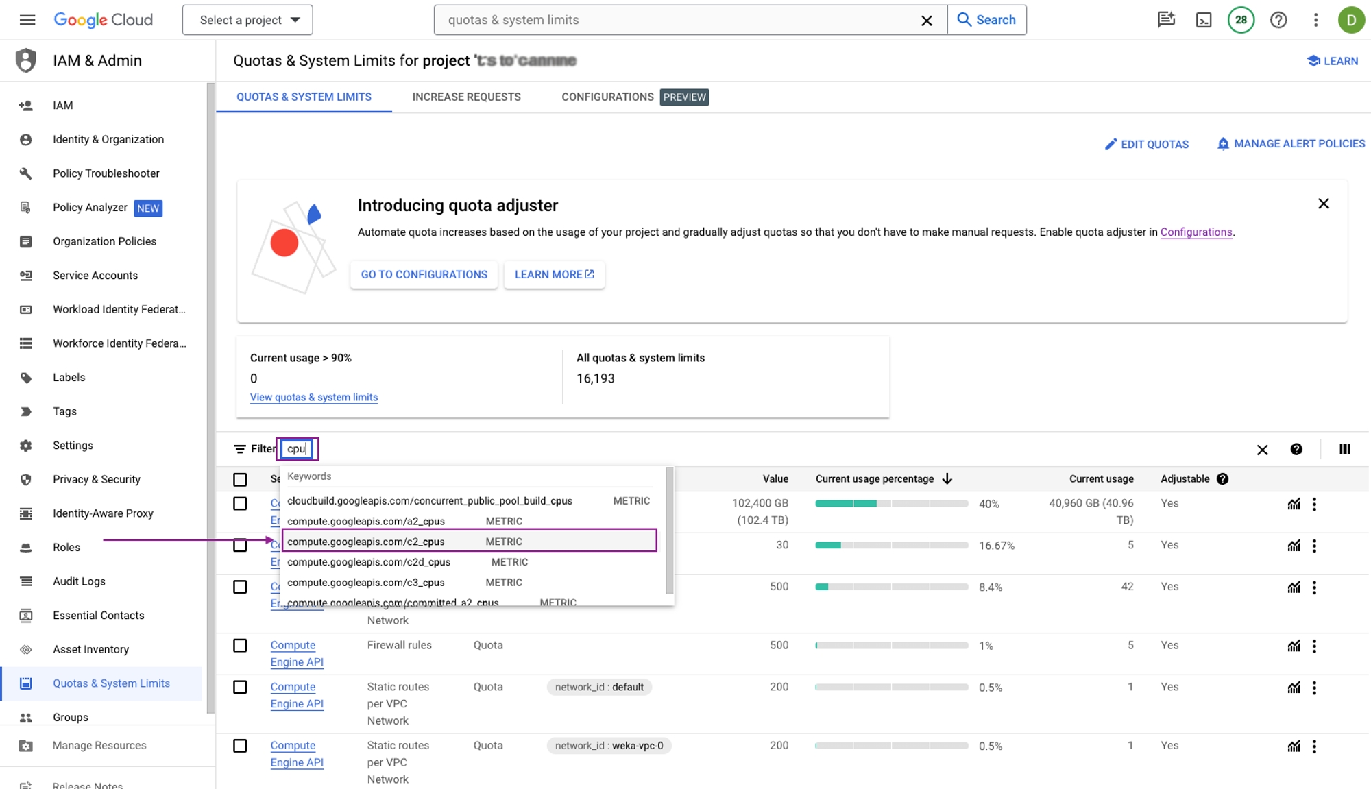Before deploying WEKA, confirm that your compute instance's CPU sizing requirements (determined in partnership with WEKA) can be met within the existing quota limits. If not, increase the quotas in your GCP project before executing the Terraform commands detailed later in this document.