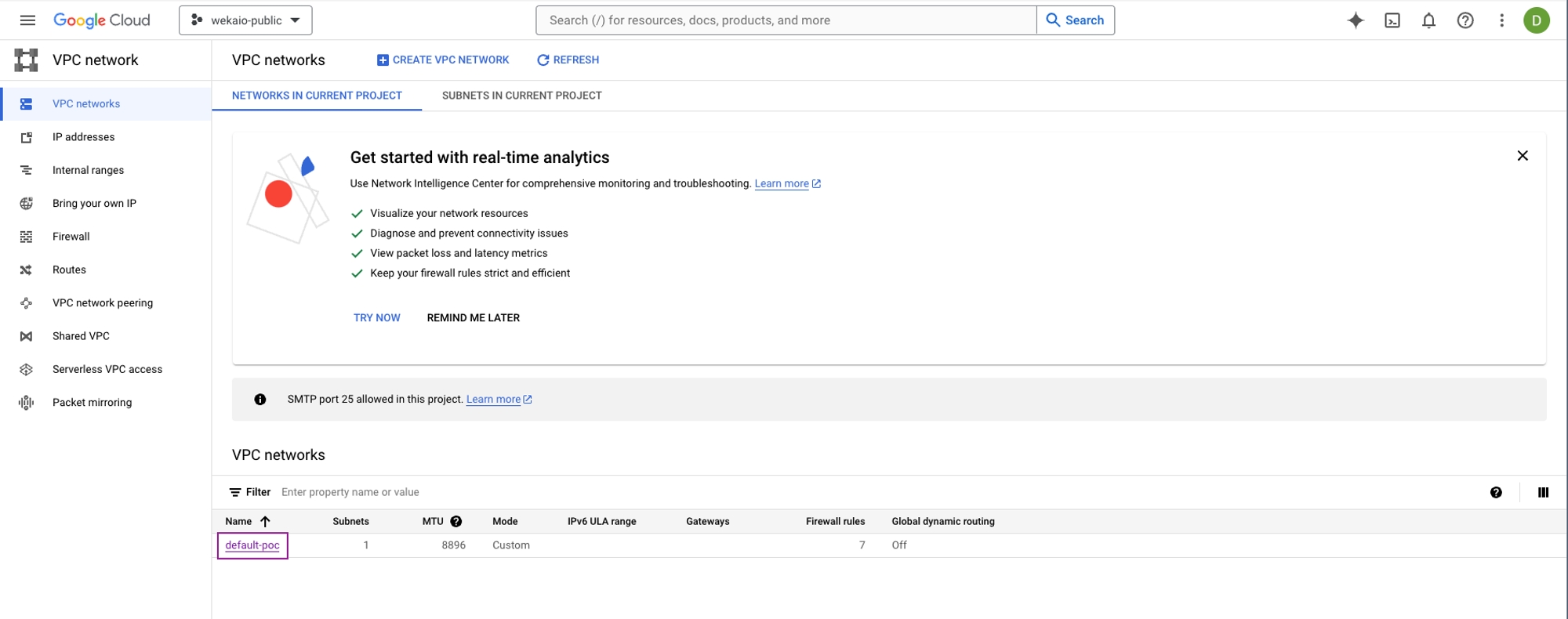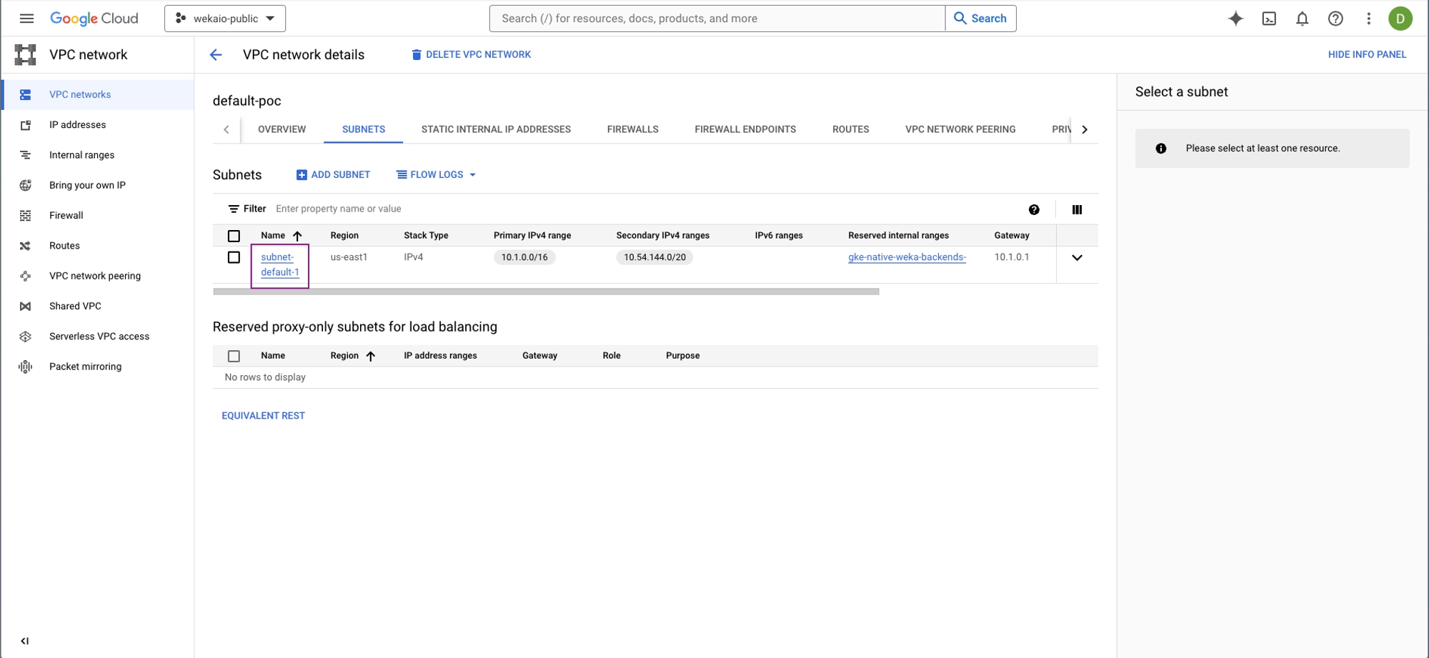 This guide assumes an already deployed VPC and the necessity of adding four WEKA-specific VPCs. This requirement arises from GCP networking constraints, where each VM instance can only have one vNIC per VPC. However, WEKA mandates a minimum of four vNICs per instance. Ensure that you have the CIDR information for the four subnets created in the new VPCs to prevent conflicts.