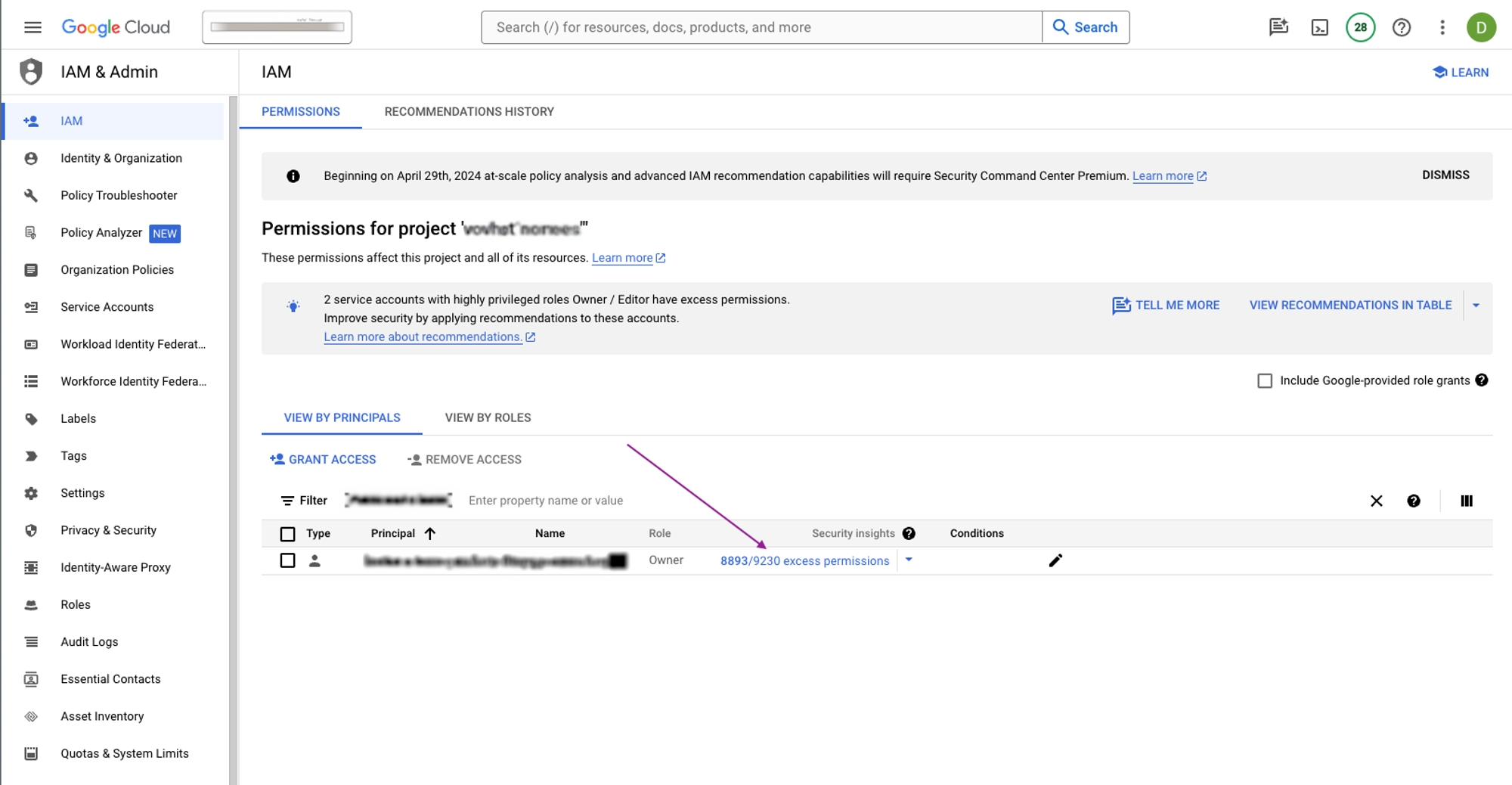 In the GCP Console, go to the Services menu and select IAM to access the Identity and Access Management dashboard.