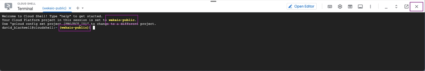 If the Terminal is not associated with the project intended for WEKA deployment, close it, switch to the correct project, and reopen it.