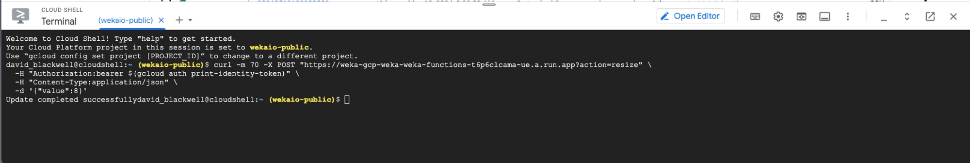 The WEKA backend cluster can be scaled out and scaled in using an API call through the GCP Cloud terminal.