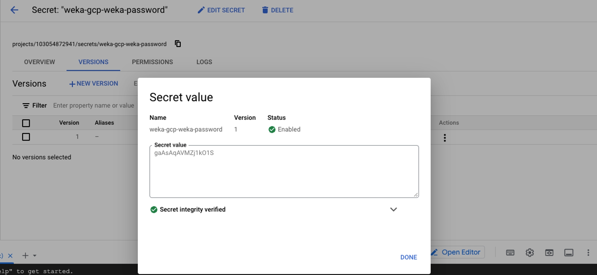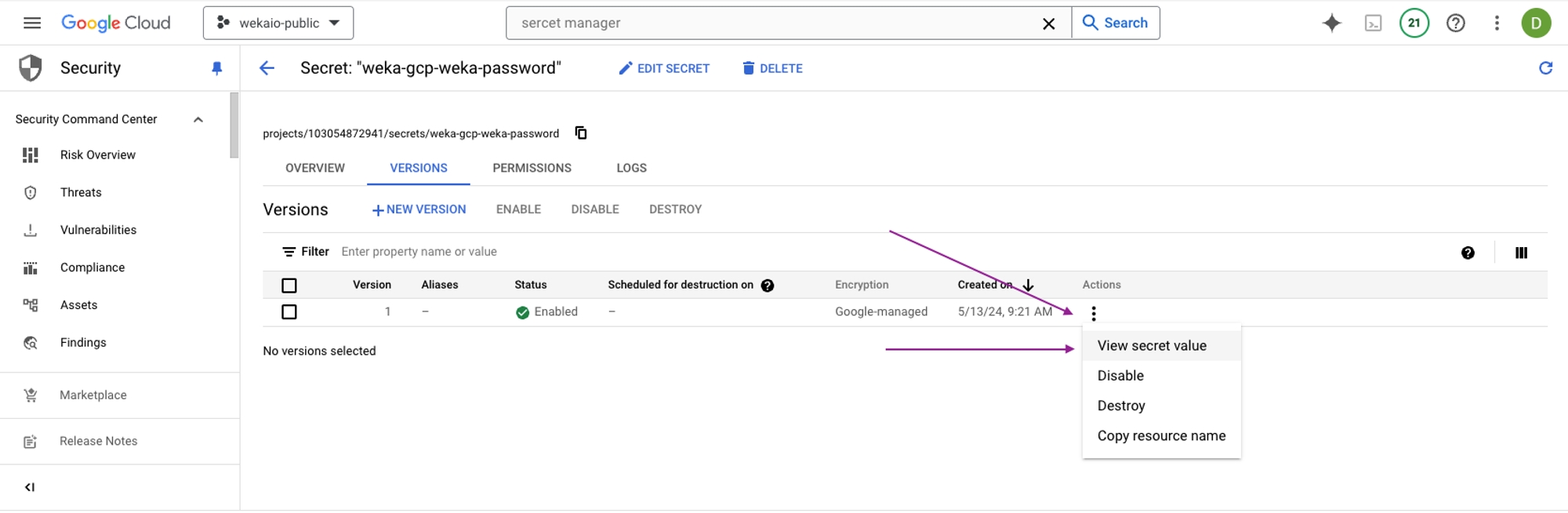 The WEKA cluster password is securely stored in the Google Cloud Platform (GCP) Secret Manager. You can retrieve it using the gcloud command from the Terraform output or through the GCP console. Follow these steps to access the password through the GCP console: