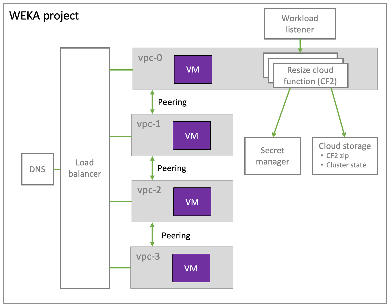 The WEKA project uses internal GCP resources. A basic WEKA project includes a cluster with multiple virtual private clouds (VPCs), virtual machines (VMs), a load balancer, DNS, cloud storage, a secret manager, and other components for managing cluster resizing. Peering between all virtual networks enables functions to run across them, with each VPC connected to every other VPC in a full mesh.