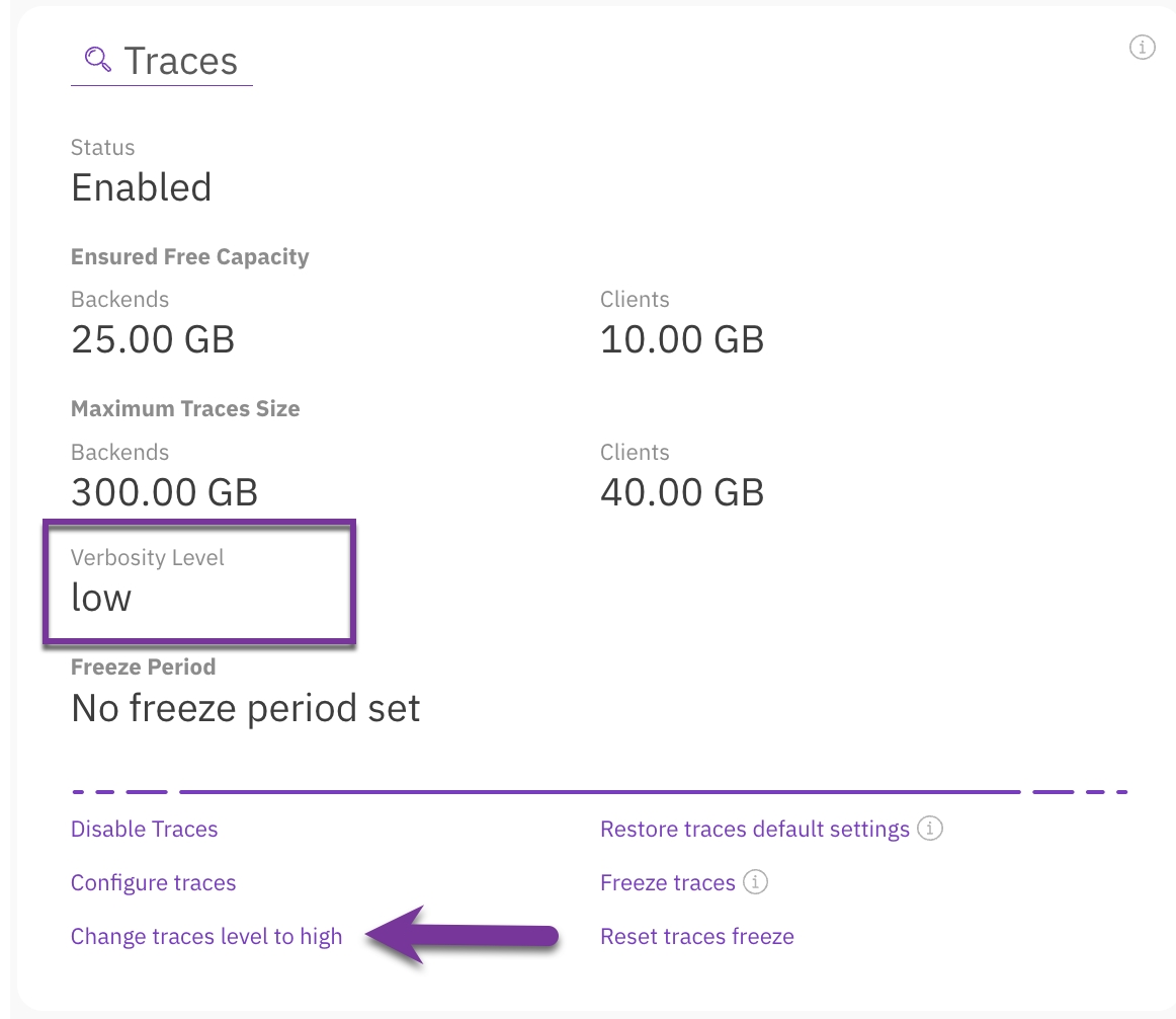 In the Traces section, depending on the current verbosity level (low or high), select Change traces level to high or Change traces level to low.