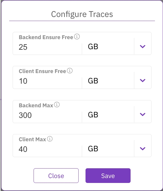 The tracking tool collects the traces on the backends and clients and retains them on their disks. You can limit the capacity used by the traces by ensuring minimum free capacity and by setting the maximum capacity that traces can use.