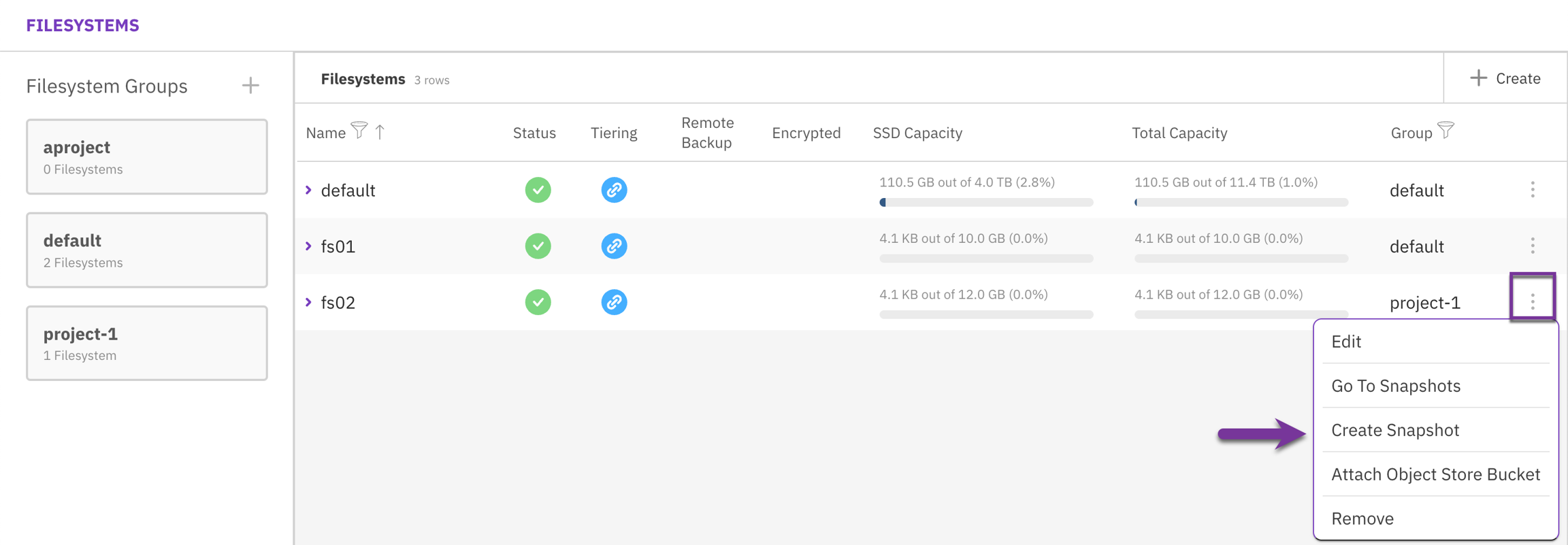 From the menu, select Manage > Filesystems. From the Filesystems page, select the three dots, and from the menu, select Create Snapshot (the source filesystem is automatically set).