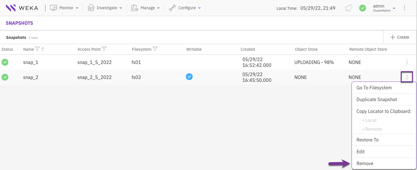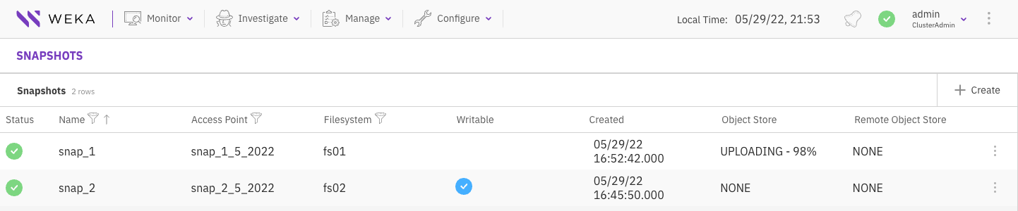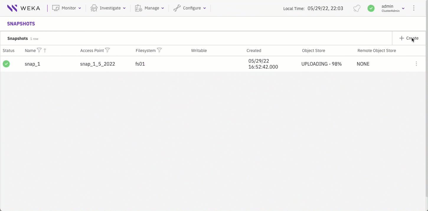 You can create a snapshot from the Snapshots page or directly from the Filesystems page.