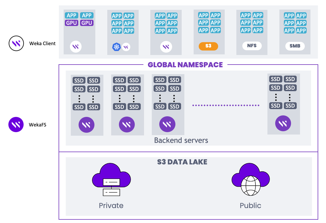 <figure><img src="https://content.gitbook.com/content/VJsIYq2tJgf6IfttPZ6j/blobs/1MJOvoV6GkW934lC2eer/v4.1_weka_architecture.png" alt=""><figcaption><p>WekaFS combines NVMe flash with cloud object storage in a single global namespace</p></figcaption></figure>