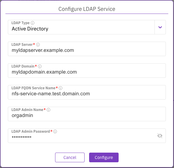 * **LDAP FQDN Service Name:** The FQDN of the NFS service. Example: `nfs-service-name.test.domain.com`