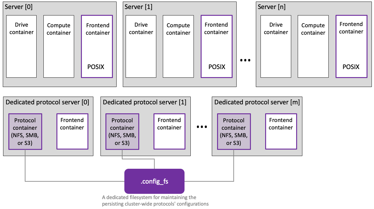 In a WEKA cluster, the frontend container provides the default POSIX protocol, serving as the primary access point for the distributed filesystem. You can also define protocol containers for NFS, SMB, and S3 clients.