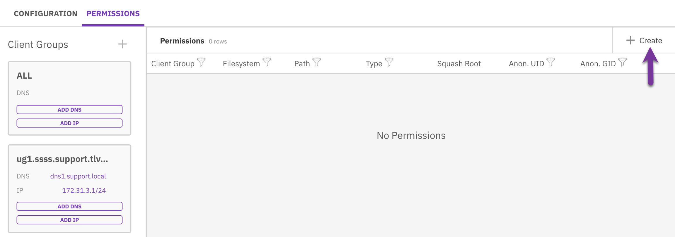 If you create an NFS v4 client permission, verify that a global configuration filesystem is already set in the system. See Configure the NFS global settings.