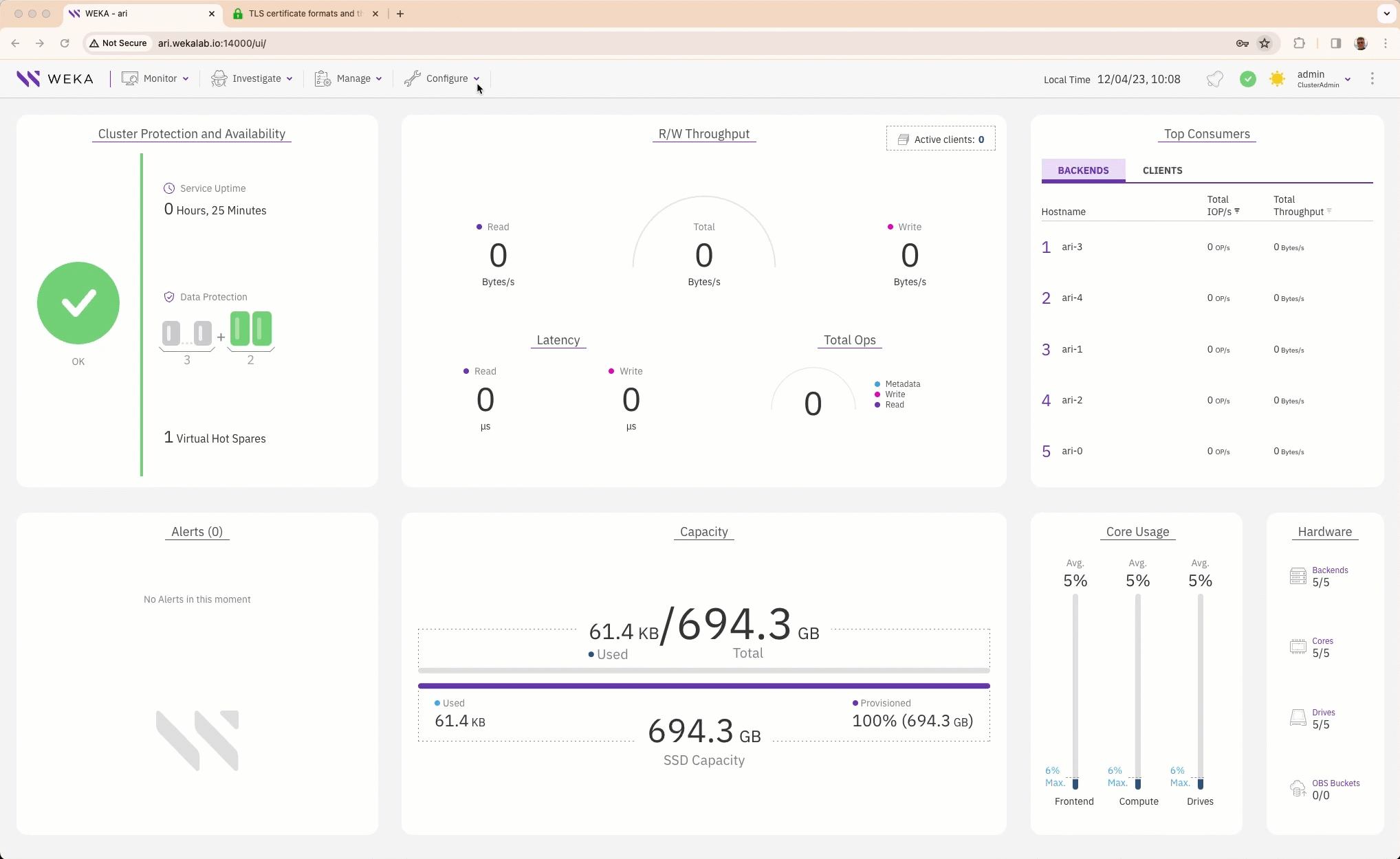 You can implement either the self-signed certificate or a custom certificate. The cluster TLS certificate is enabled using an auto-generated self-signed certificate, providing access to the GUI, CLI, and API through HTTPS. If a custom TLS certificate is preferred, you can set in place of the auto-generated self-signed certificate.