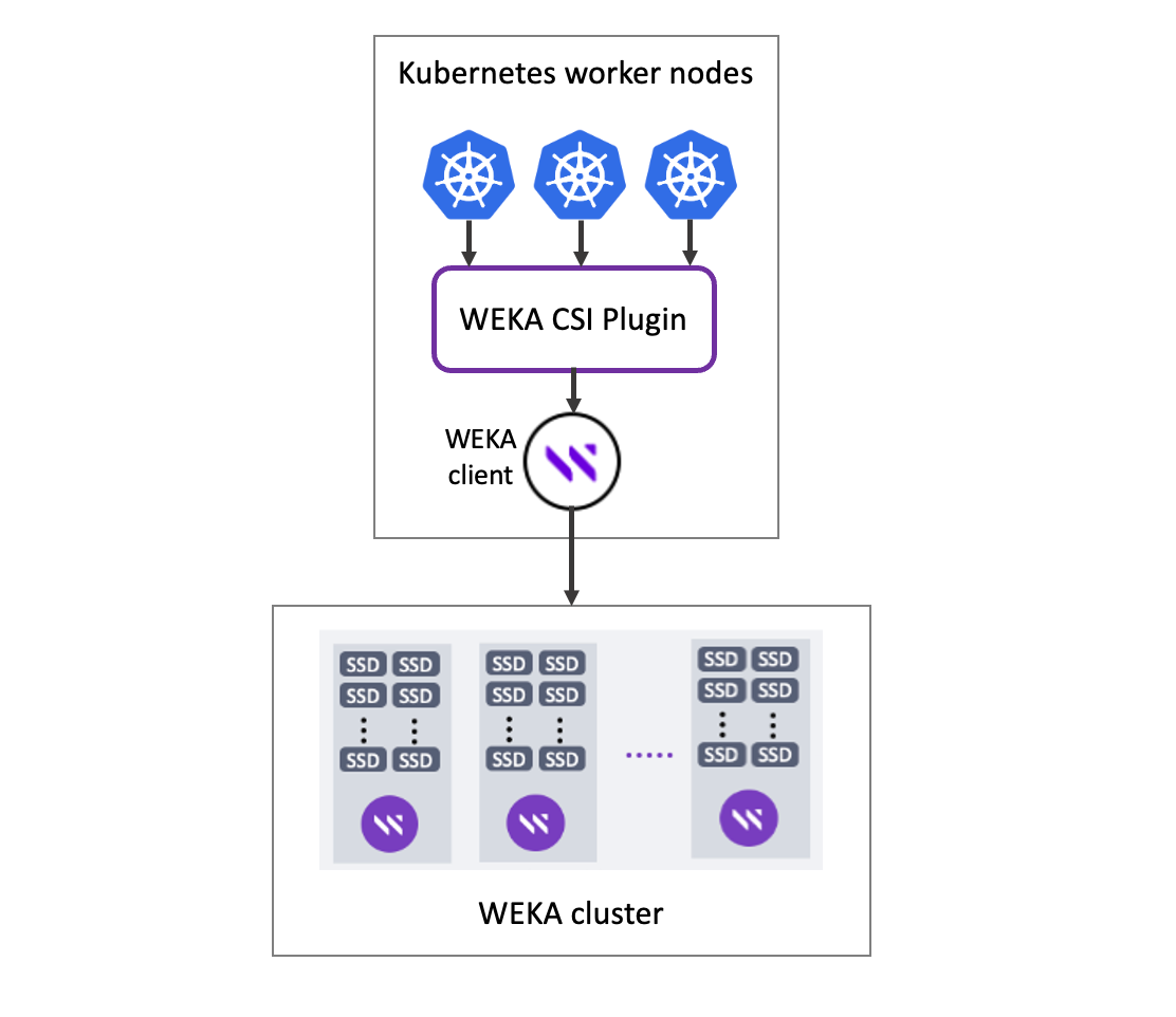 The WEKA CSI Plugin interfaces Kubernetes worker nodes and control plane with the WEKA clients. It enables the creation and configuration of persistent storage external to Kubernetes. It is based on the CSI Plugin standard.