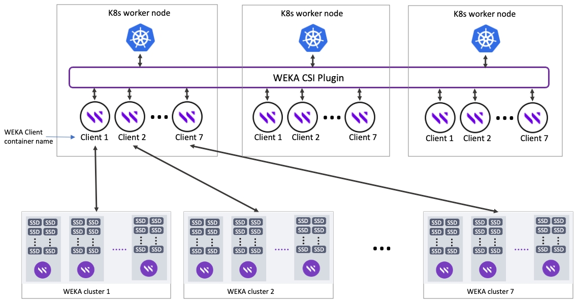 A single K8s worker node can be connected to multiple WEKA clusters (maximum 7 clusters) simultaneously.