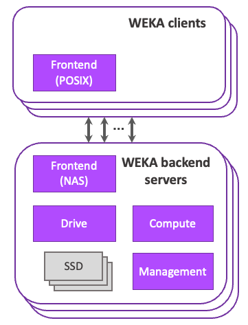 In the dedicated backend architecture, the WEKA filesystem is mounted on the login and compute servers, requiring a WEKA frontend process on login and compute processes for file access (Figure 4).