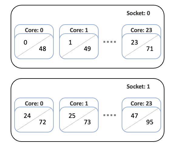 Continuing through the /proc/cpuinfo file we find a relationship between the sockets, cores, and processors that is summarized in Figure 6. Namely, the processor IDs are ordered from 0-23 on Socket 0, then 24-47 on Socket 1. Then, the second hyperthreads are numbered from 48-71 on Socket 0 and 72-95 on Socket 1.