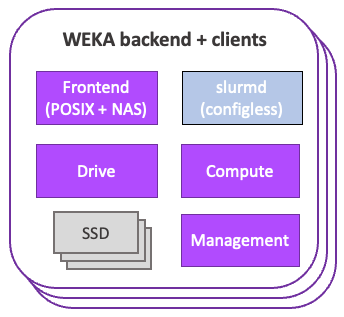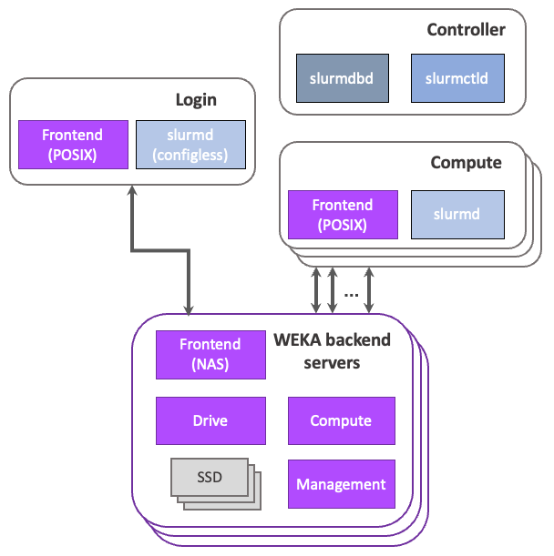 In either scenario, the Slurm login and compute nodes function as WEKA clients. The controller does not participate in the WEKA filesystem, serving neither as a backend server nor a client.