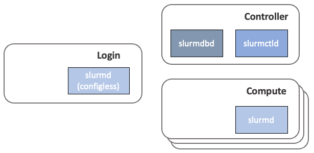 Typically, a Slurm cluster consists of one or more controller hosts that run the Slurm controller and Slurm database daemons. These are a set of compute nodes where users run their workloads and one or more login nodes used to access the cluster.
