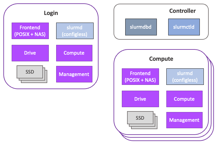 The controller hosts the Slurm job scheduler, while the login and compute nodes all host data as part of the WEKA data platform.