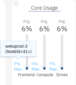 This widget shows the average usage and the maximum load level of the Frontend, Compute, and Drive cores. Hovering the maximum value displays the most active server and the NodeID number.