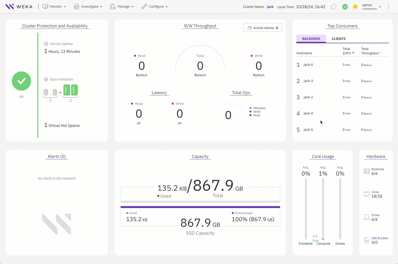 The system dashboard contains widgets that provide an overview of the WEKA system, including an overall status, R/W throughput, top consumers, alerts, capacity, core usage, and hardware.