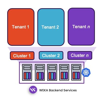 WEKA enables multi-tenancy by allowing multiple cluster deployments to share the same hardware while maintaining full resource isolation. This is achieved through a Kubernetes Operator that facilitates the composition of resource sets—including hosts, drives, cores, and memory—into independent clusters.