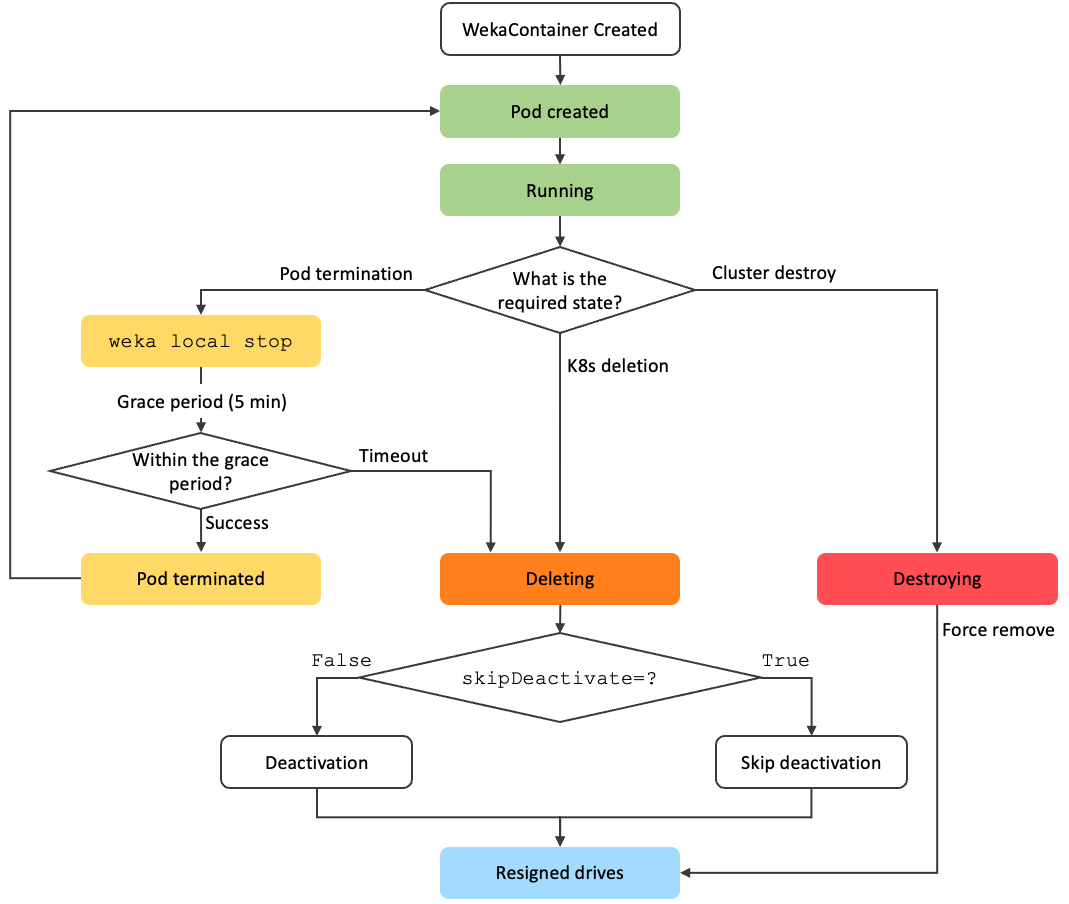 weka local stoptimes out or fails, the specific Weka container instance tied to that terminating pod may transition to theDeletingstate (as per the diagram) to ensure proper deactivation and removal from the Weka cluster's perspective (leading to data loss for that instance).Important: Because the