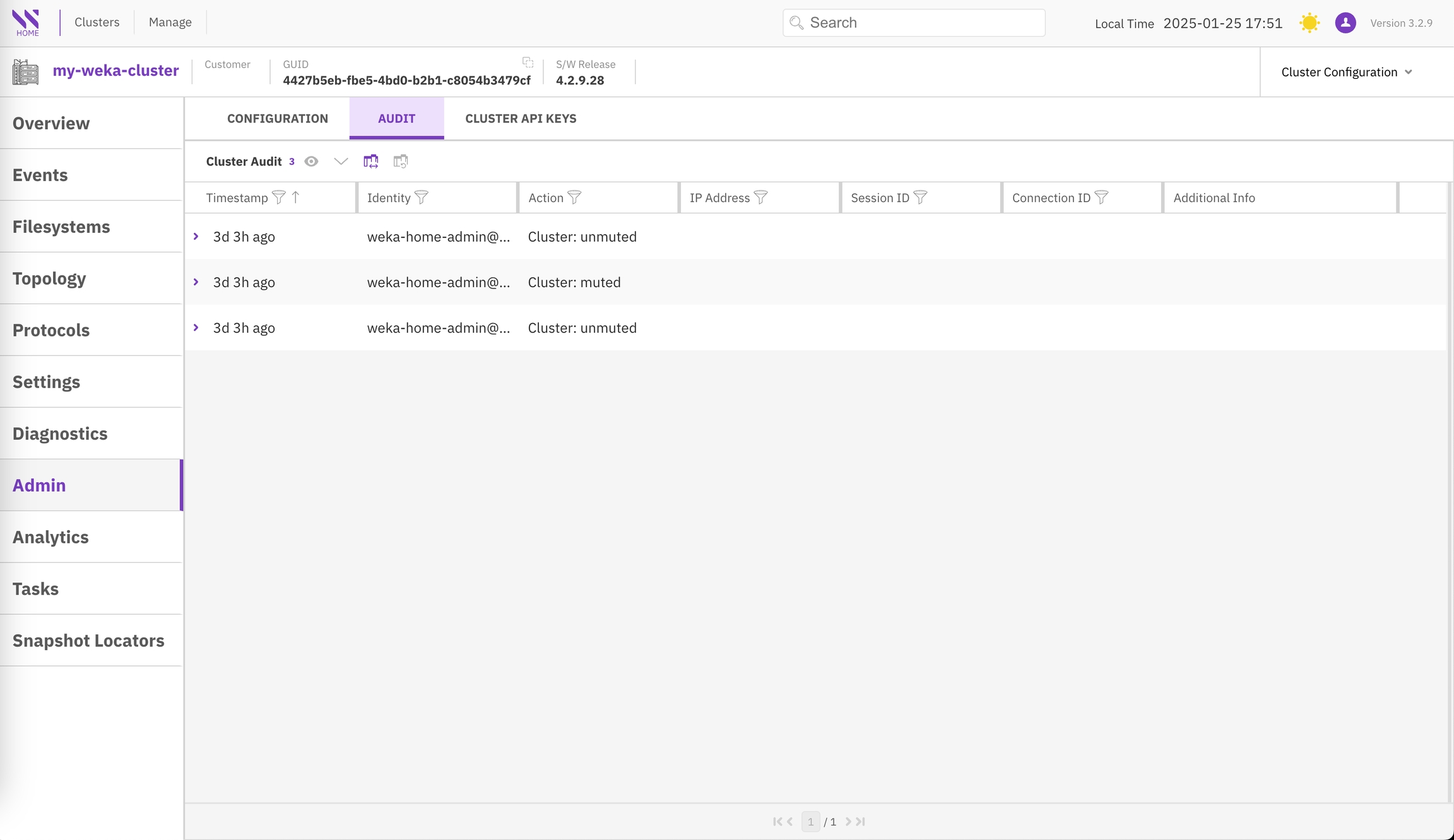 Mute Cluster: Temporarily disable alert and event notifications from the cluster to Local WEKA Home. This feature is useful for reducing alert noise during maintenance activities.