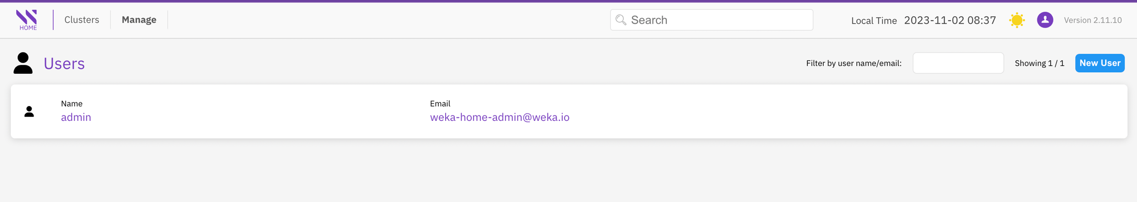 The Users page presents the current list of users who have login access to Local WEKA Home and provides the option to add new users. Authentication for access is done using a local username and password.