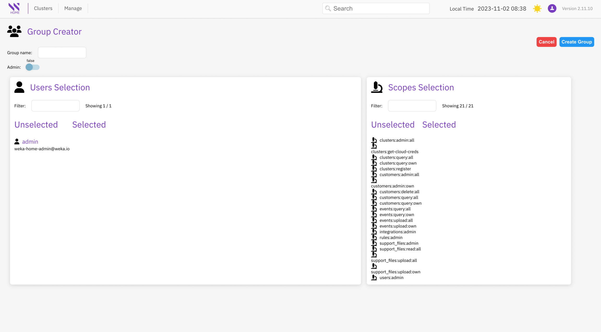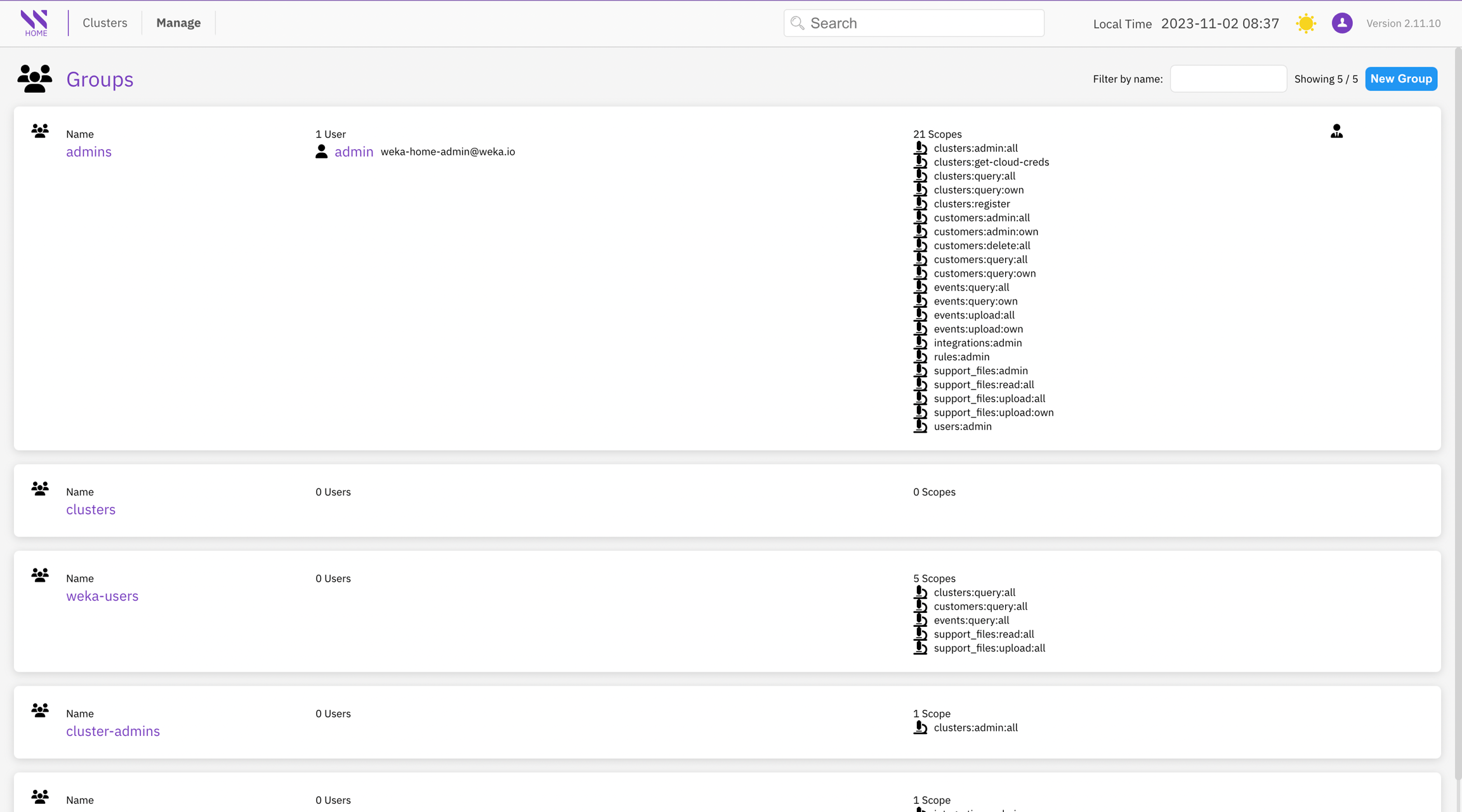 The Group Management page offers a comprehensive view of all groups, their respective members, and the scopes (roles) associated with each group's access or visibility within the Local WEKA Home.