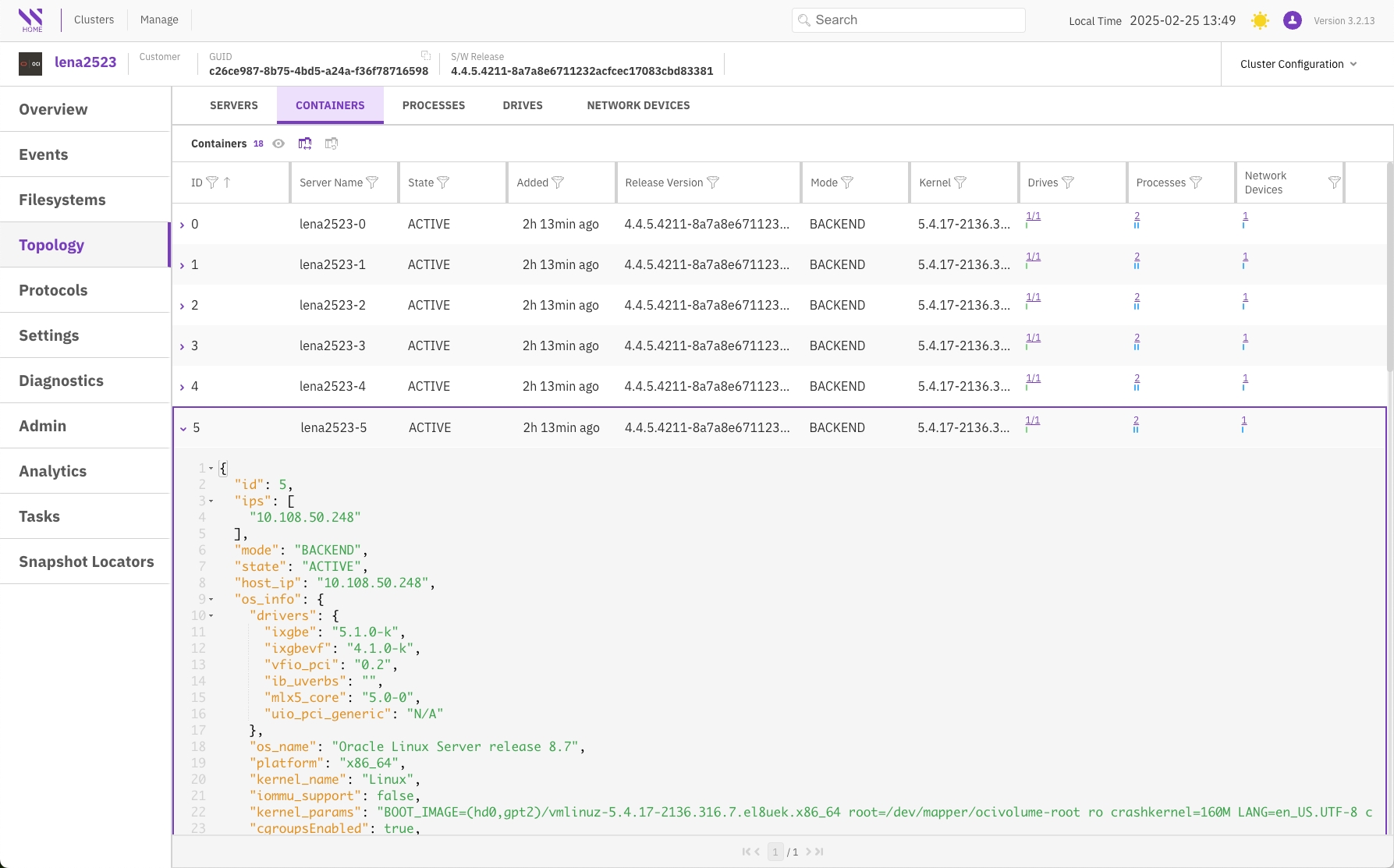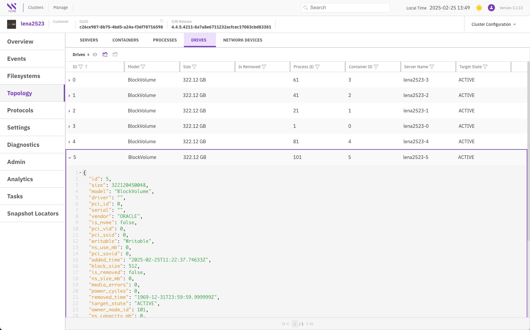 The Topology page presents an array of cluster configurations categorized into sections: Servers, Containers, Processes, Drives, and Network Devices.
