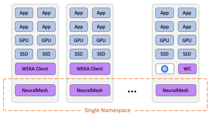 NeuralMesh Axon unifies storage and compute resources into a single, scalable, high-performance system deployed directly on the same infrastructure as GPU applications. The combination of containerized isolation, local NVMe integration, and a single global namespace delivers a flexible and efficient architecture for modern AI workloads.