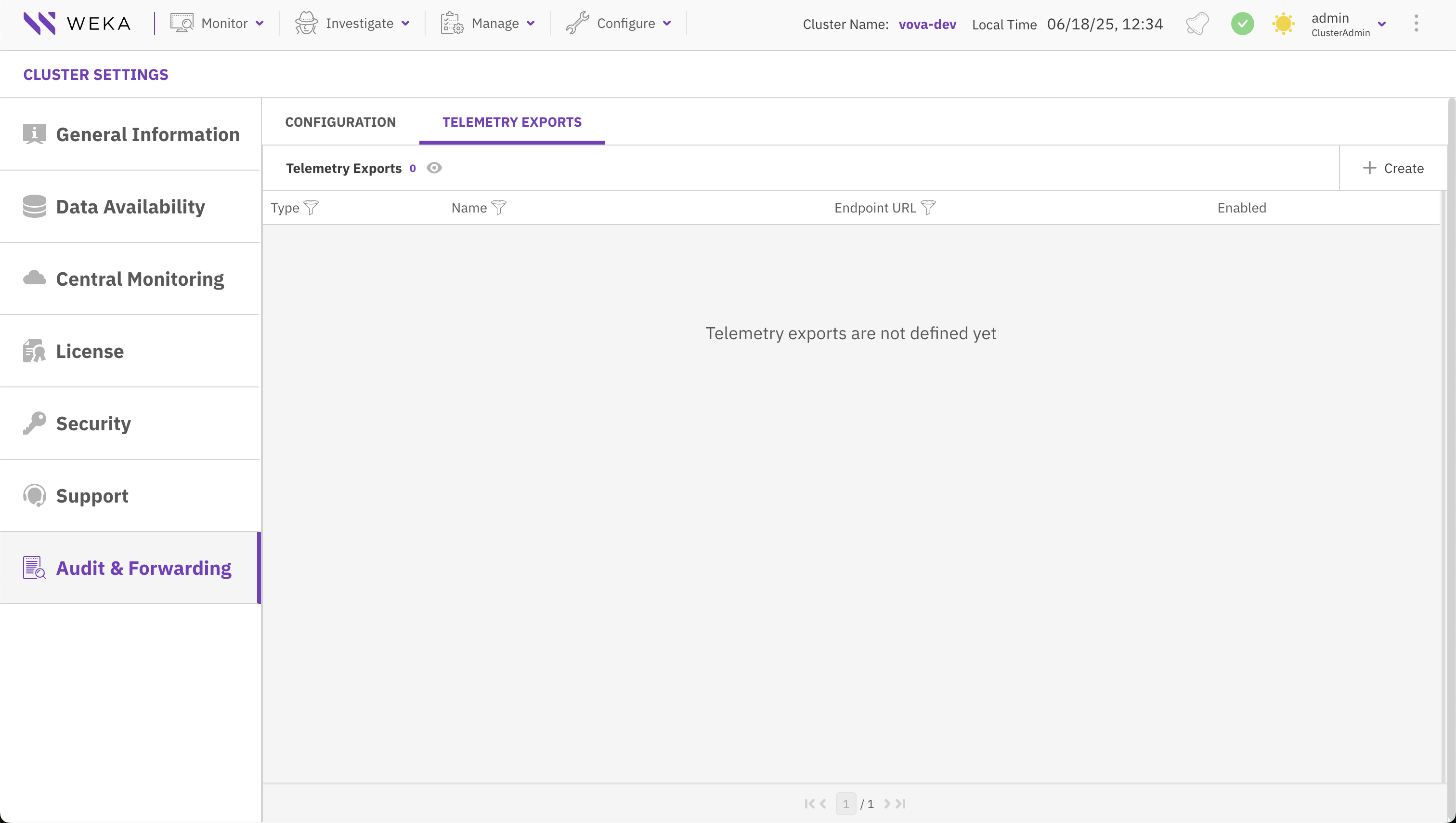 1. From the **Telemetry Exports** tab, select **+ Create**.